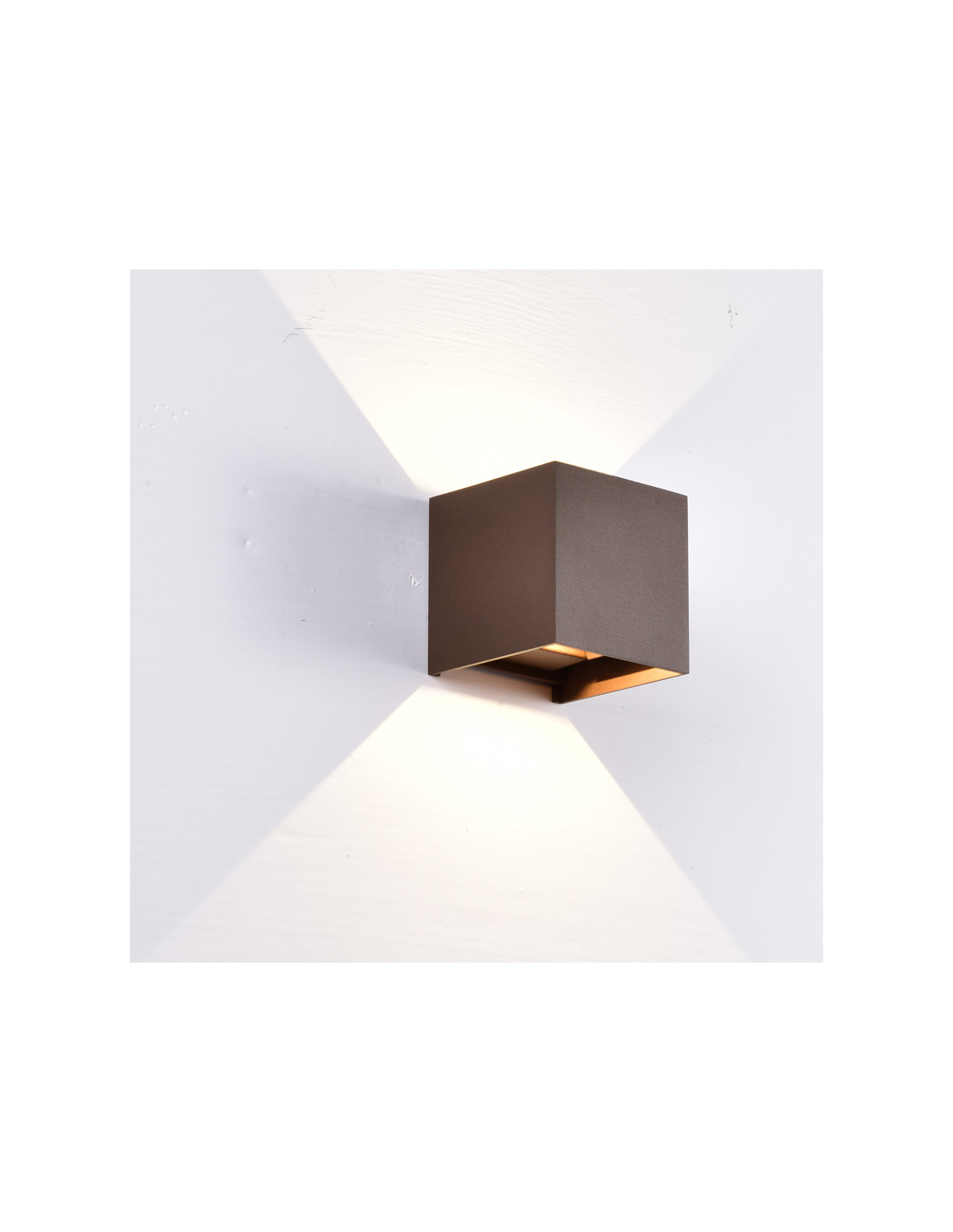Moderno aplique para exterior o interior en forma de cubo con posibilidad de regular el ángulo de la luz que emite. Luz led indirecta en color cálido (3000K). Resistente estructura de aluminio, con acabados color gris oscuro, blanco, negro arenado, corten. Consumo 12 watios. Potencia 1.100 lúmenes. IP54. Medidas 10x10x10 cms.
