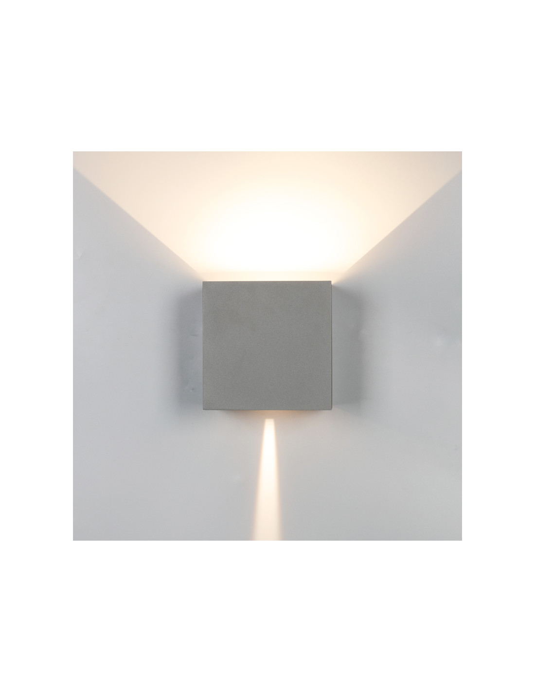 Moderno aplique para exterior o interior en forma de cubo con posibilidad de regular el ángulo de la luz que emite. Luz led indirecta en color blanco neutro (4000K). Resistente estructura de aluminio, con acabados color gris oscuro, blanco, negro arenado, corten. Consumo 20 watios. Potencia 1.830 lúmenes. IP54. Medidas 15x15x15 cms.