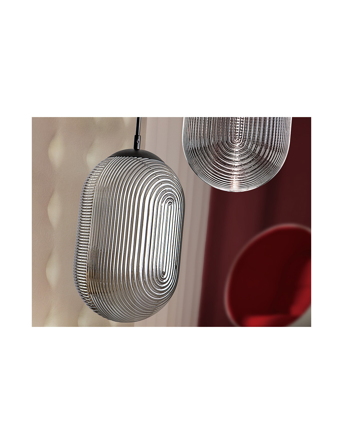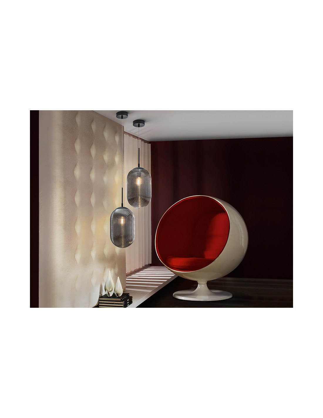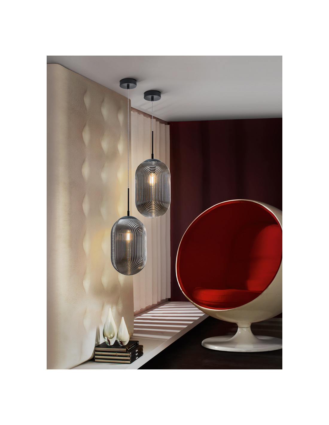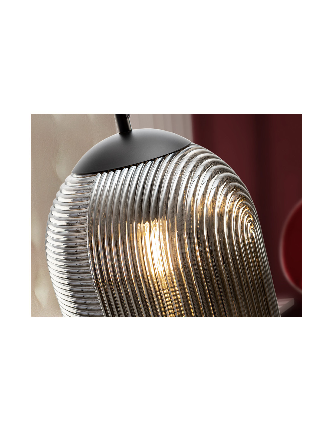 Lámpara de 1 luz , realizada en metal acabado negro mate. Tulipa tono gris smoke espejado, con grabado de lineas. Regulable en altura.