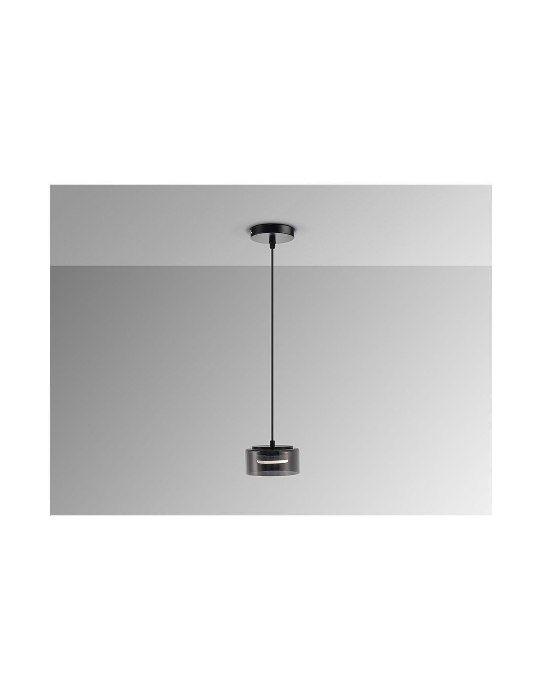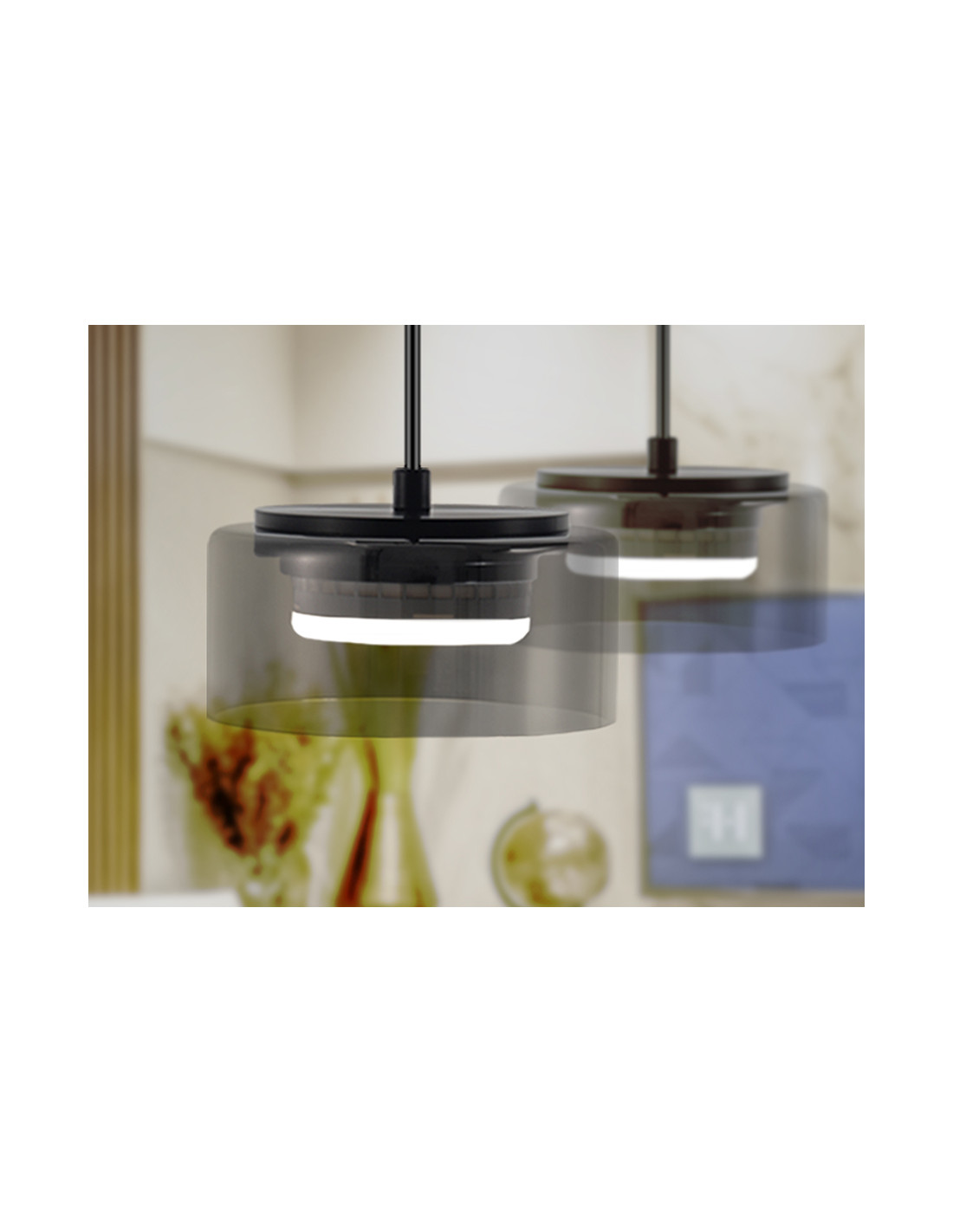 Lámpara realizada en metal acabado negro mate. Tulipa de cristal smoky. Regulable en altura.