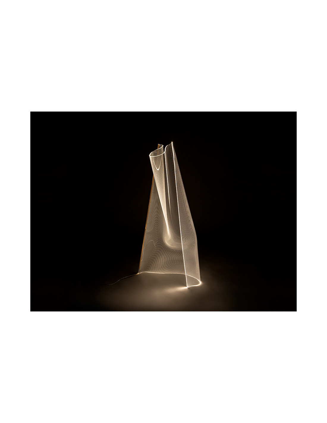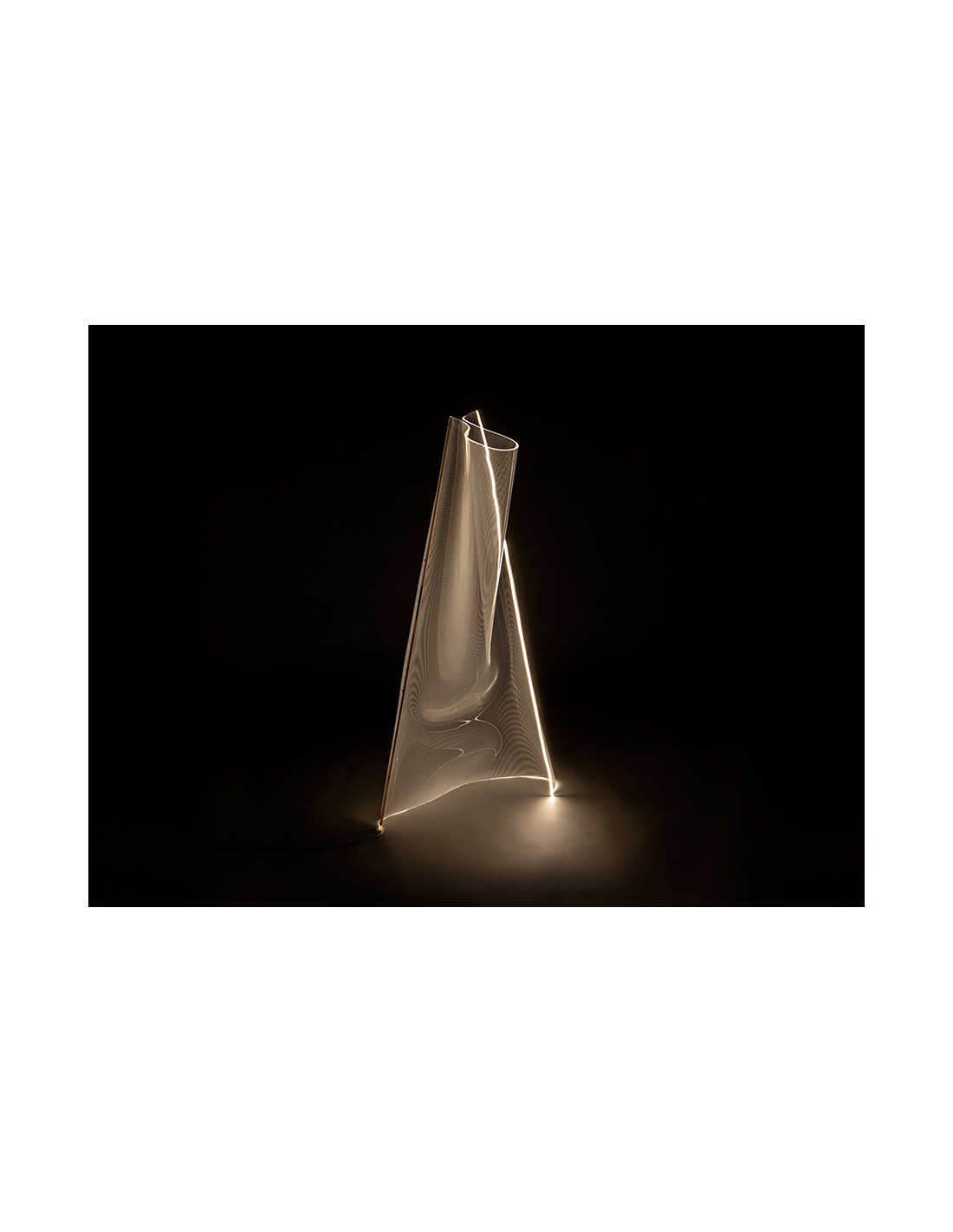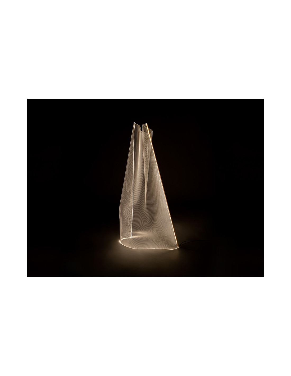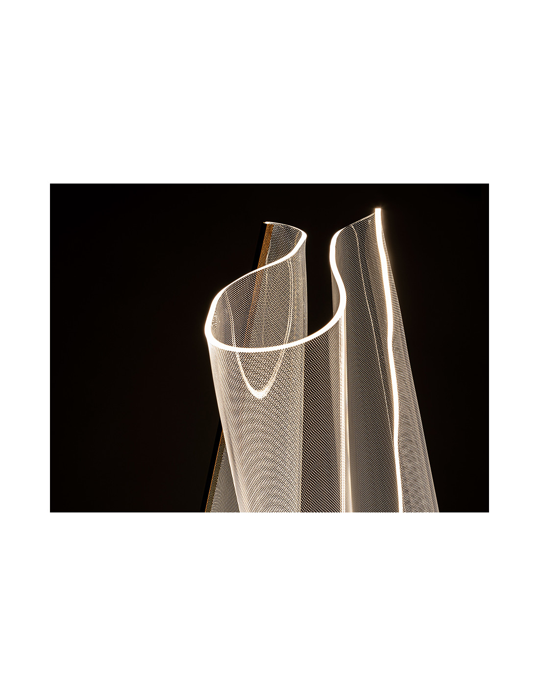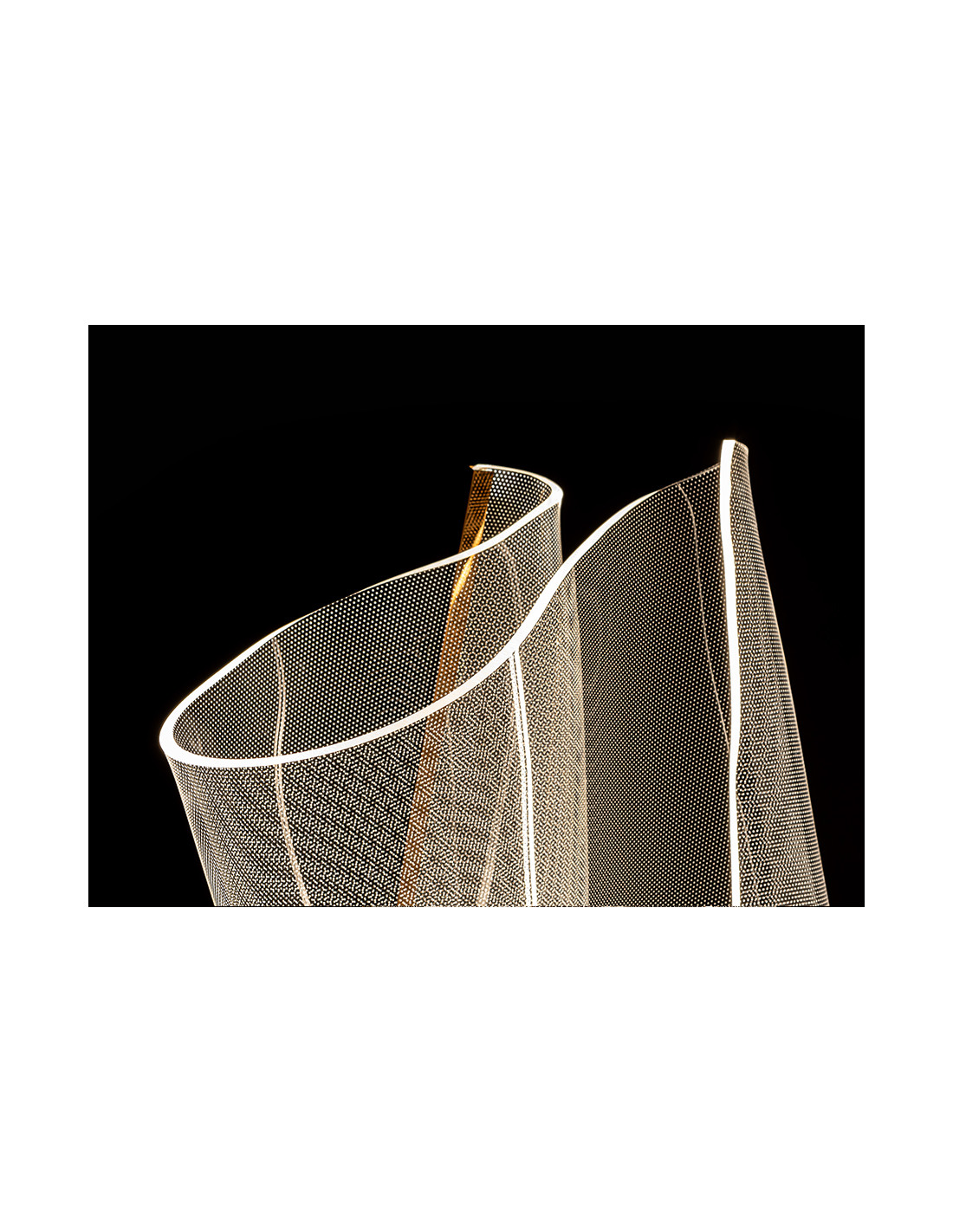 Lámpara de pie formada por una lámina de metacrilato microimpreso moldeado y perfil metálico color oro rosa. Iluminación LED 17W 1.564lm 3.000K.