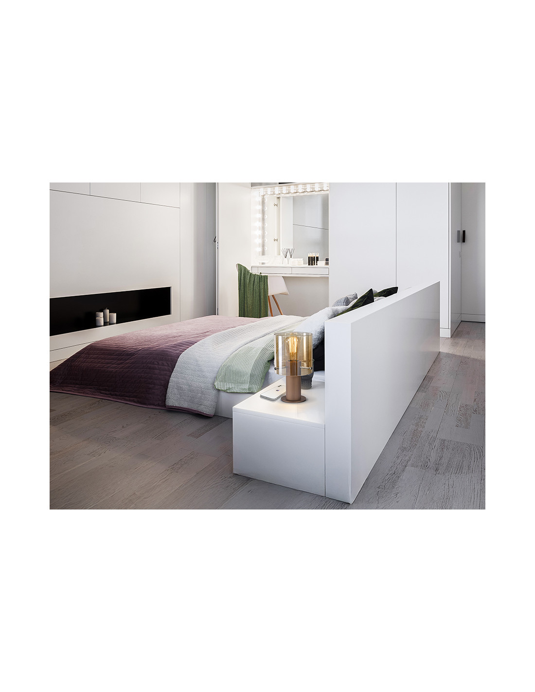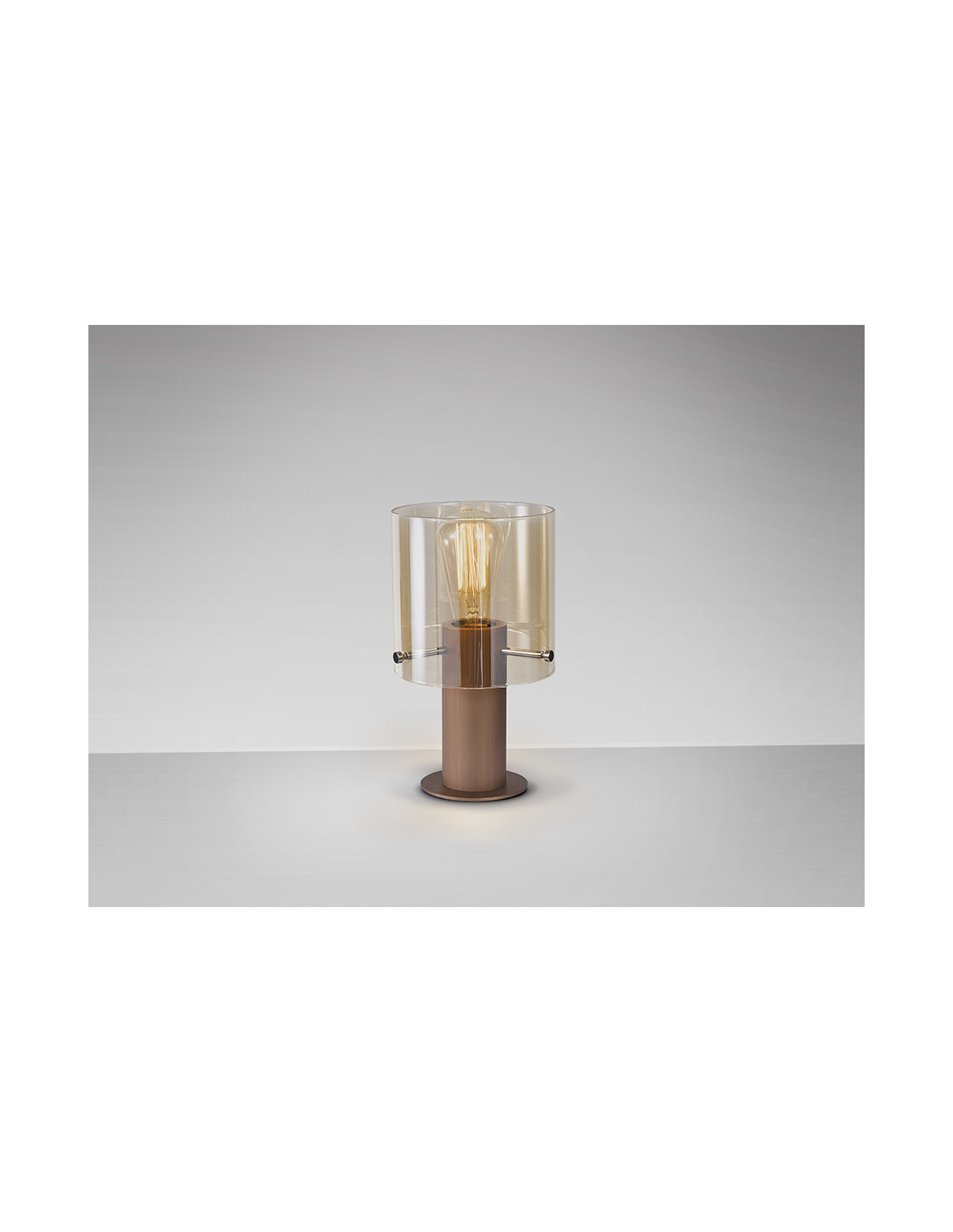 Lámpara de sobremesa realizada en metal acabado cobre satinado. Tulipa de cristal ámbar. Cable textil. Portalámparas E27.