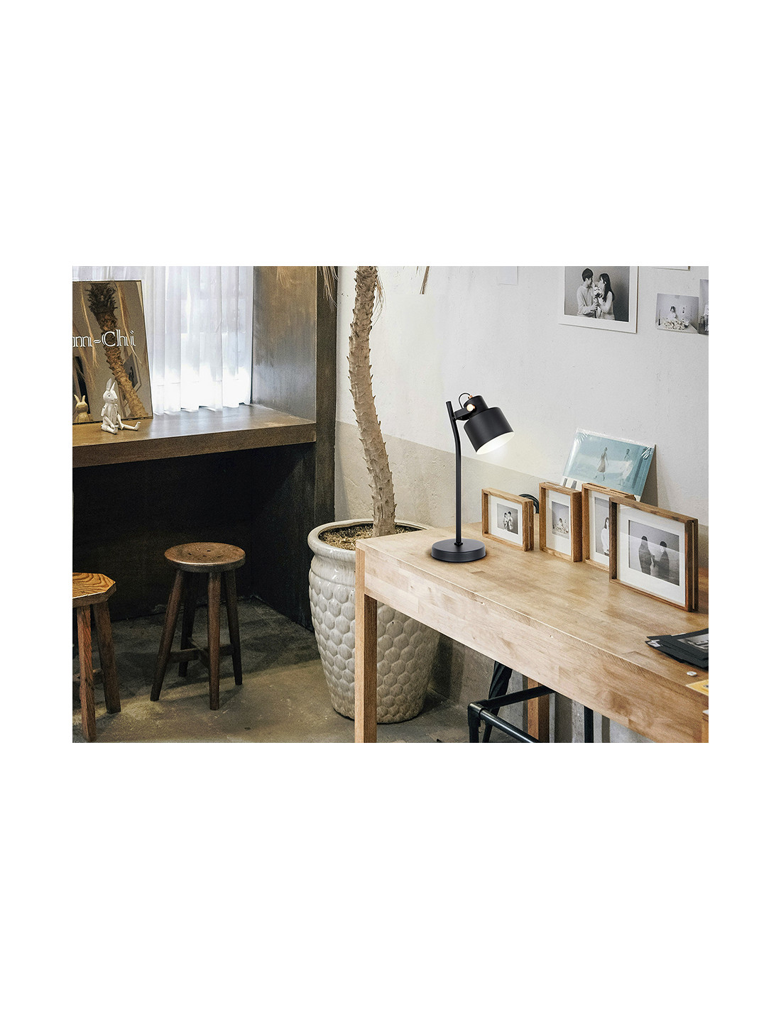 Lámpara de sobremesa realizada en metal acabado negro mate, detalles en cobre satinado. Pantalla con inclinación regulable. 1 E27
