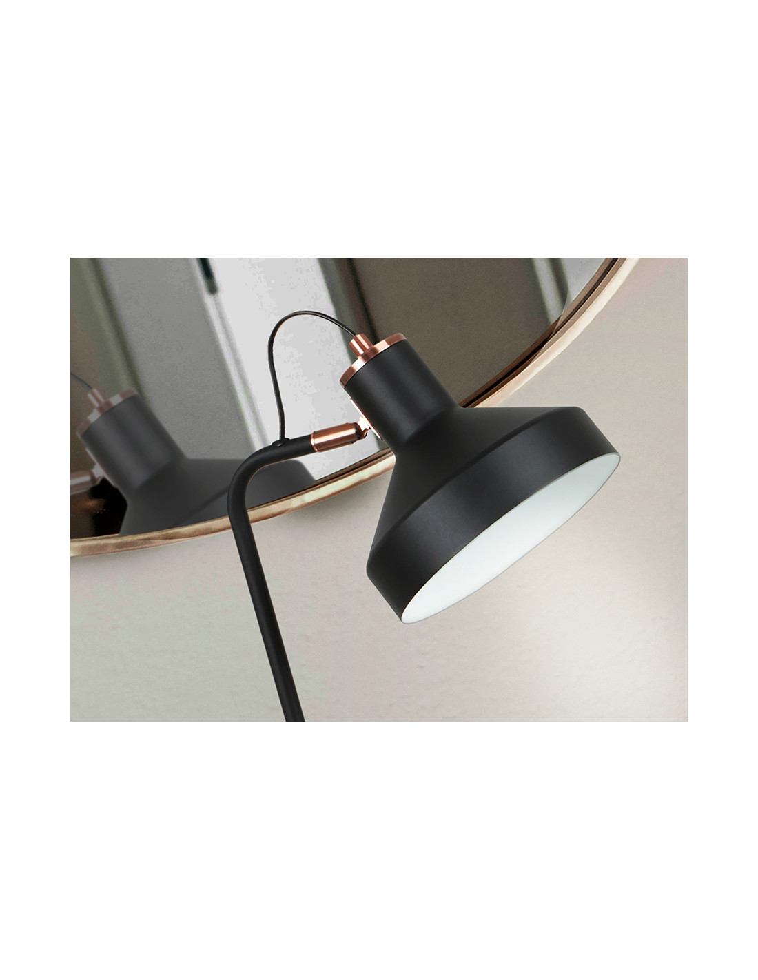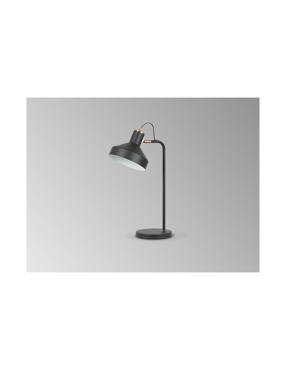 Lámpara de sobremesa realizada en metal acabado negro mate y detalles en cobre satinado. Pantalla con inclinación regulable. 1 E27