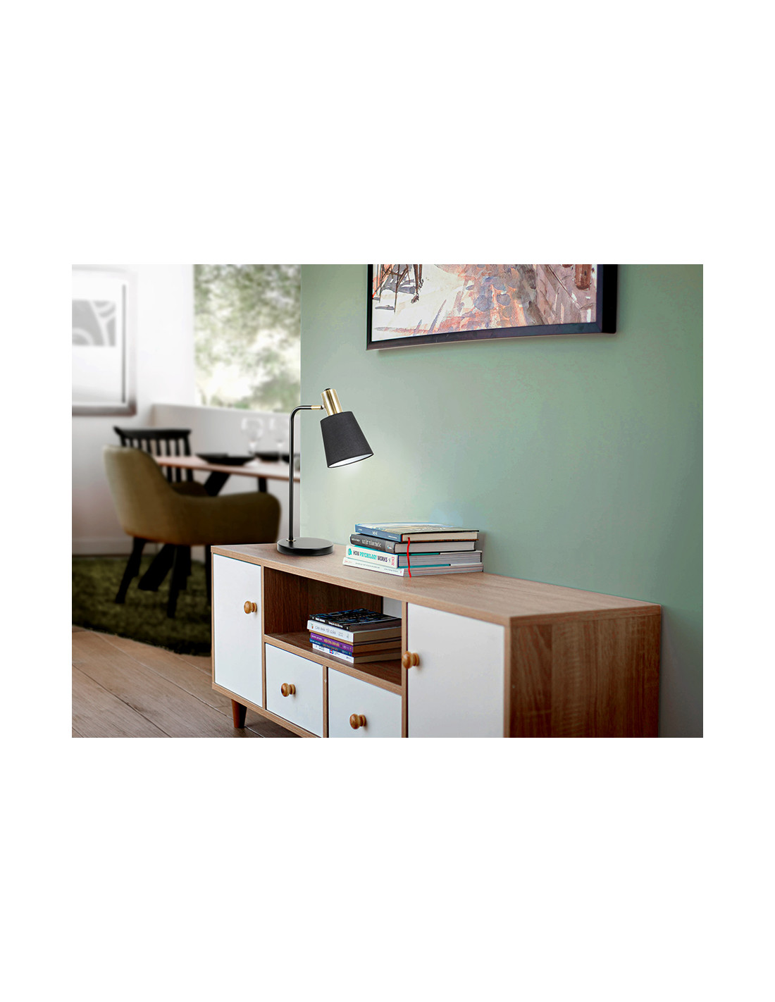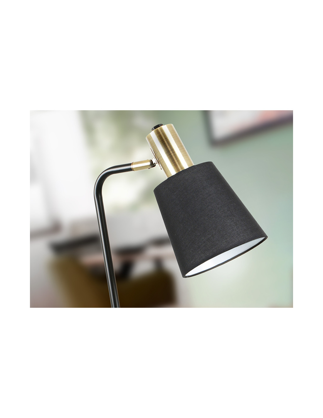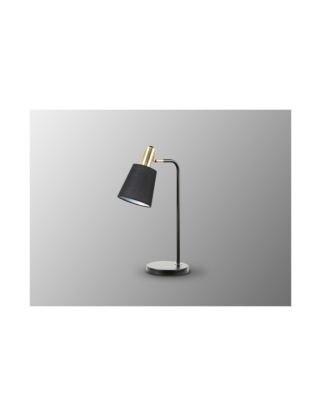 Lámpara de sobremesa realizada en metal acabado negro mate y detalles en latón satinado. Pantalla textil negra con inclinación regulable. 1 E27