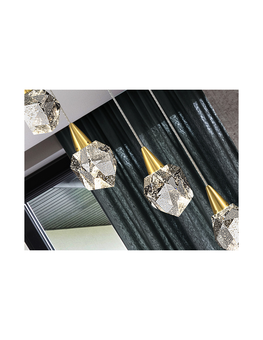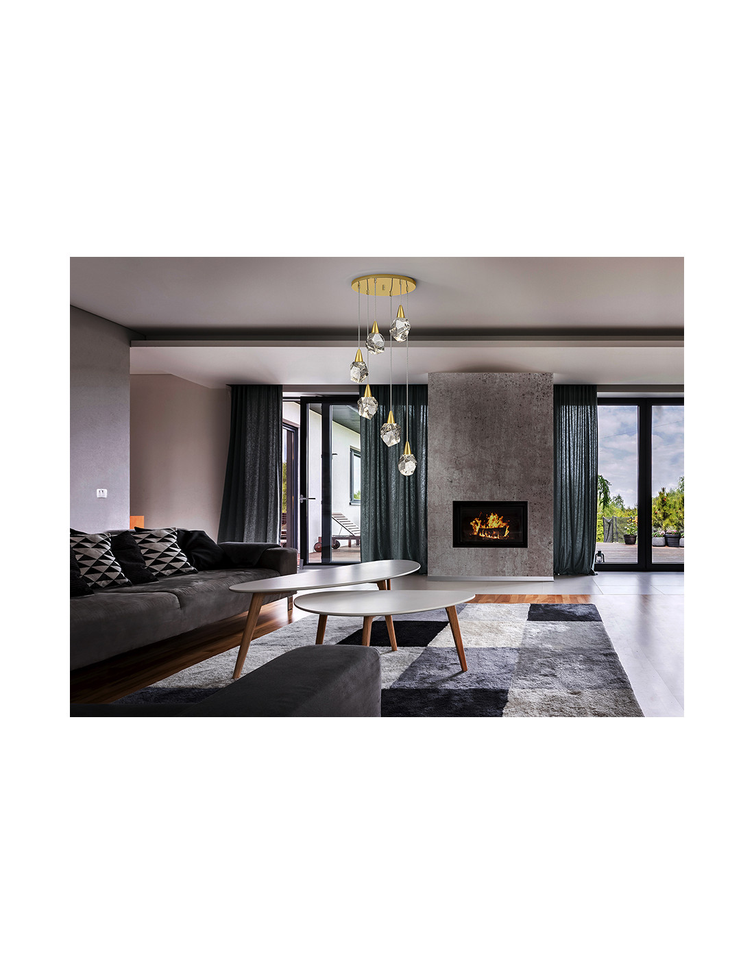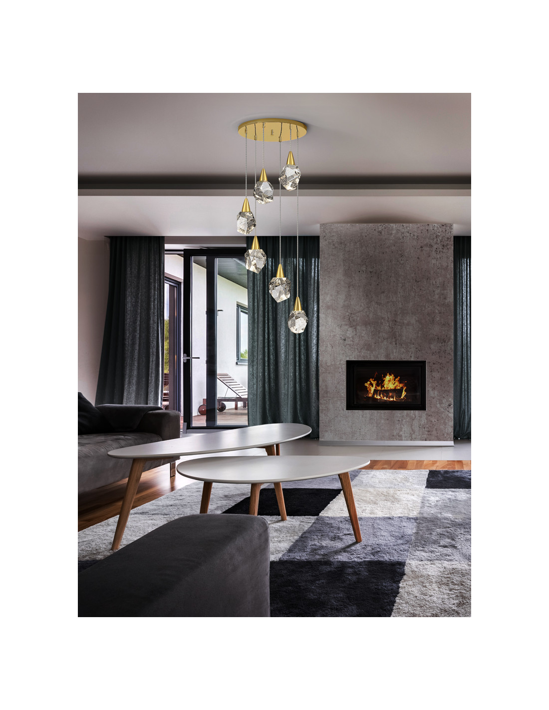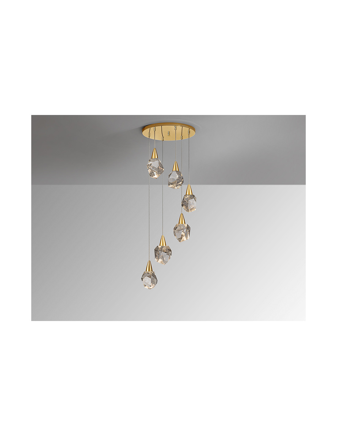 Lámpara de 6 luces LED, realizada en metal acabado oro mate. Tulipas poliédricas realizadas en cristal macizo con burbujas decorativas en su interior. Regulable en altura. 24W LED. 2700 lm. 3.000 K