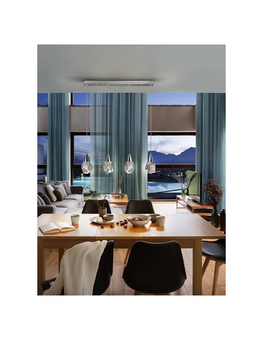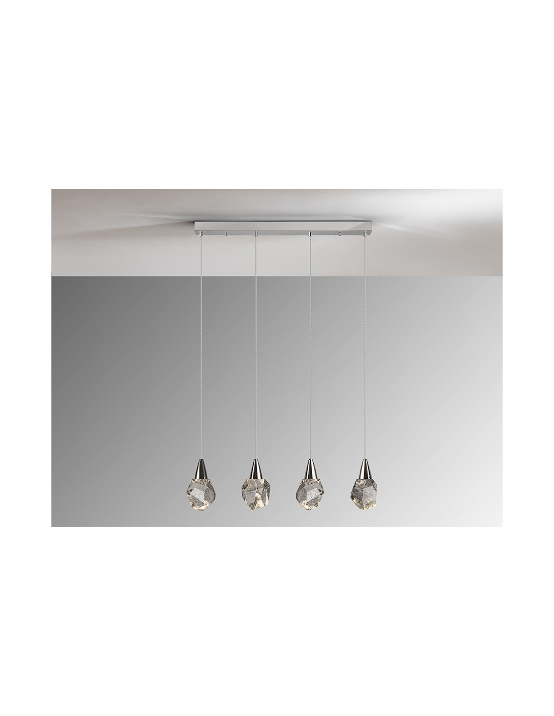 Lámpara de 4 luces LED, realizada en metal acabado cromo. Tulipas poliédricas realizadas en cristal macizo con burbujas decorativas en su interior. Regulable en altura. 16W LED. 1.800 lm. 3.000 K
