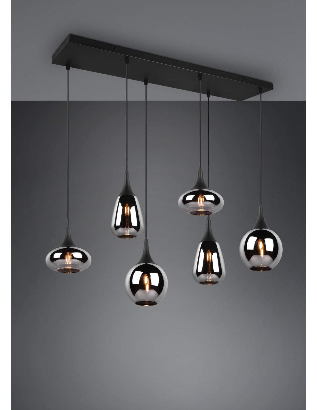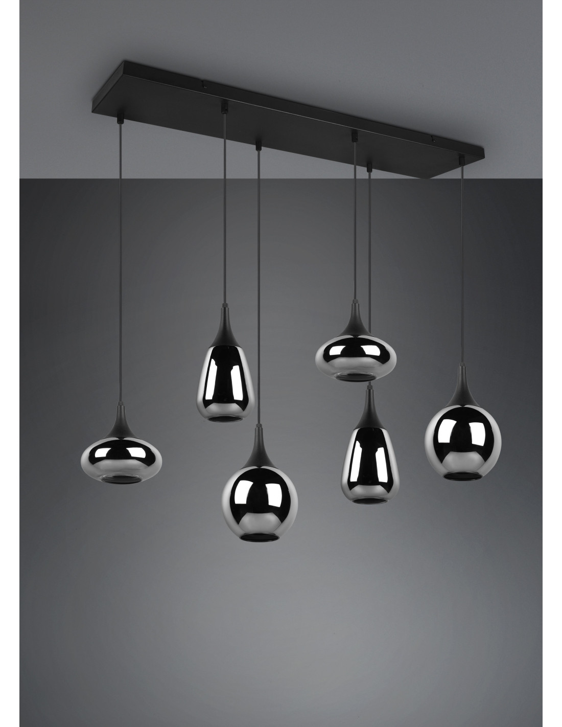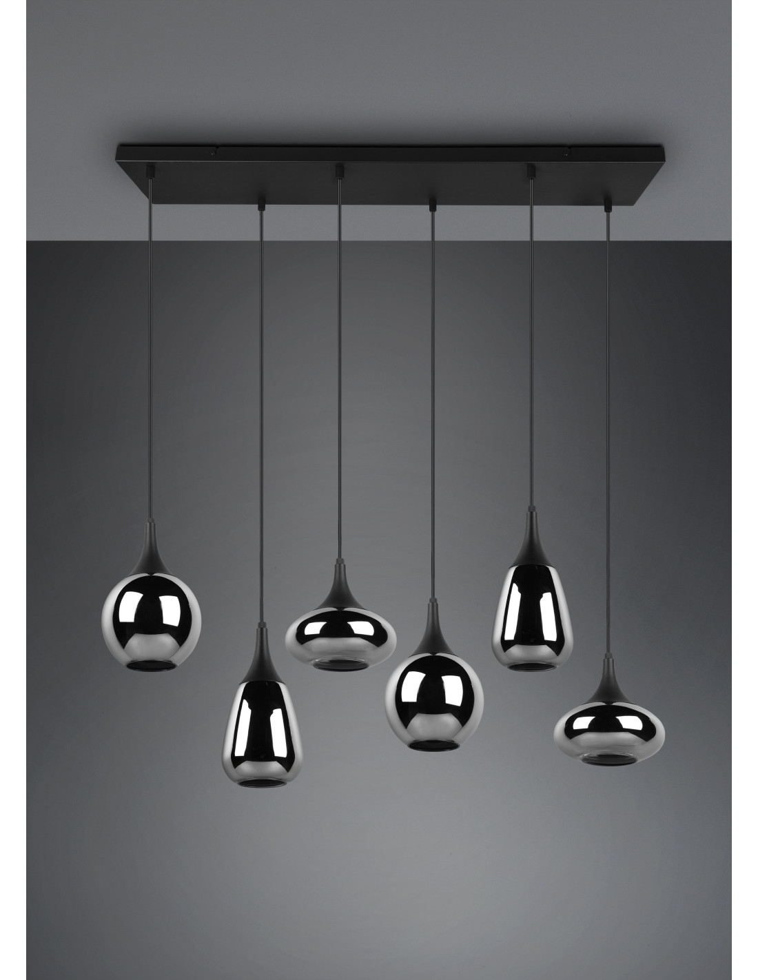 ¡La luminaria colgante LUMINA llamará la atención en su salón gracias a sus nobles tulipas de cristal! Las diferentes formas de las seis tulipas y la composición del metal y el vidrio crean una atmósfera luminosa hermosa y única y dan un toque moderno a tu comedor. Gracias al diseño cromático en negro mate y a las tulipas de cristal en cromo vaporizado, hay mucho margen para otros tonos de color, lo que facilita su integración en conceptos de vivienda existentes. Para una iluminación que ahorre energía, se recomienda utilizar una bombilla LED. Se trata de una alternativa óptima a las lámparas halógenas convencionales y ofrecen una alta calidad de luz y un ahorro de energía de hasta el 80 %. Además, las lámparas LED le ayudan a beneficiarse de una larga vida útil, una baja generación de calor y al mismo tiempo protegen el medio ambiente.