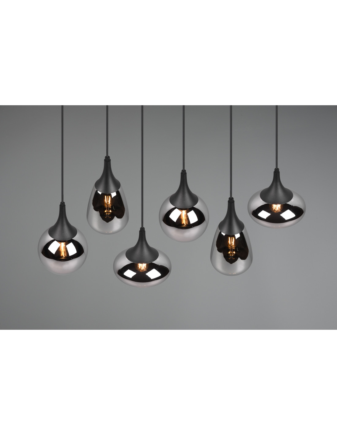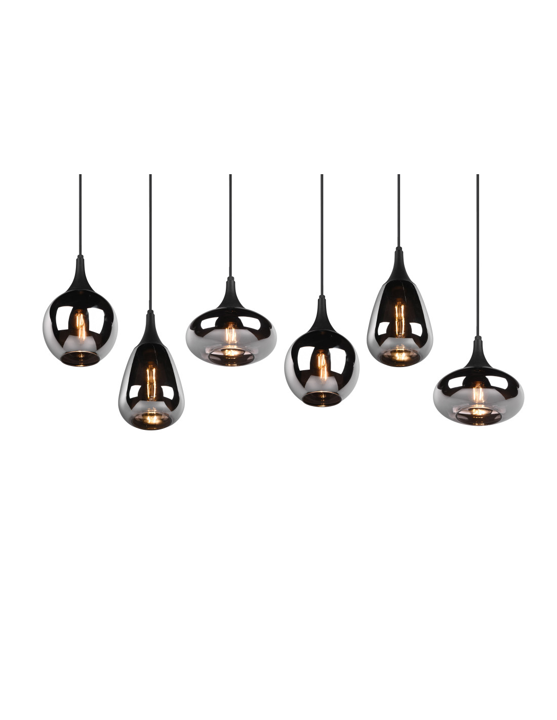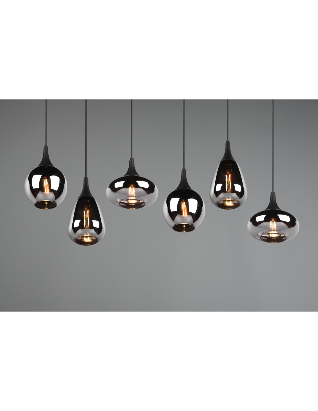 ¡La luminaria colgante LUMINA llamará la atención en su salón gracias a sus nobles tulipas de cristal! Las diferentes formas de las seis tulipas y la composición del metal y el vidrio crean una atmósfera luminosa hermosa y única y dan un toque moderno a tu comedor. Gracias al diseño cromático en negro mate y a las tulipas de cristal en cromo vaporizado, hay mucho margen para otros tonos de color, lo que facilita su integración en conceptos de vivienda existentes. Para una iluminación que ahorre energía, se recomienda utilizar una bombilla LED. Se trata de una alternativa óptima a las lámparas halógenas convencionales y ofrecen una alta calidad de luz y un ahorro de energía de hasta el 80 %. Además, las lámparas LED le ayudan a beneficiarse de una larga vida útil, una baja generación de calor y al mismo tiempo protegen el medio ambiente.