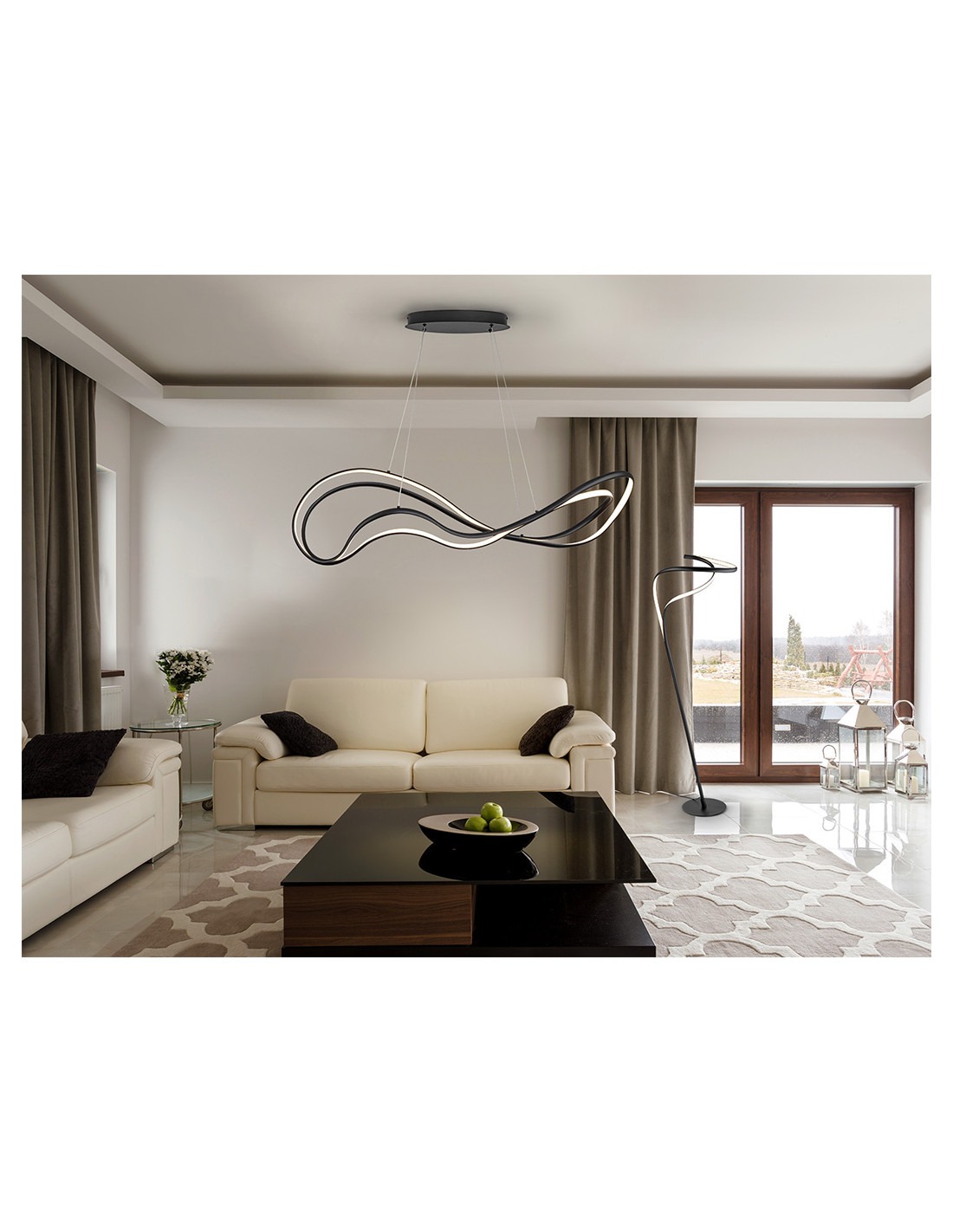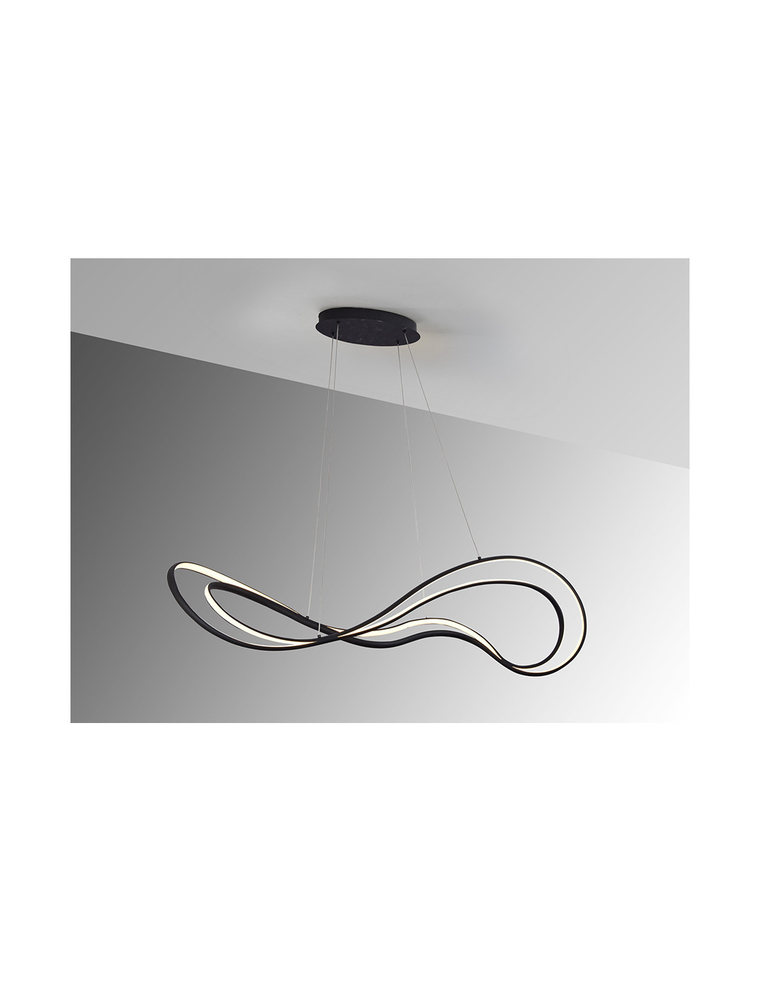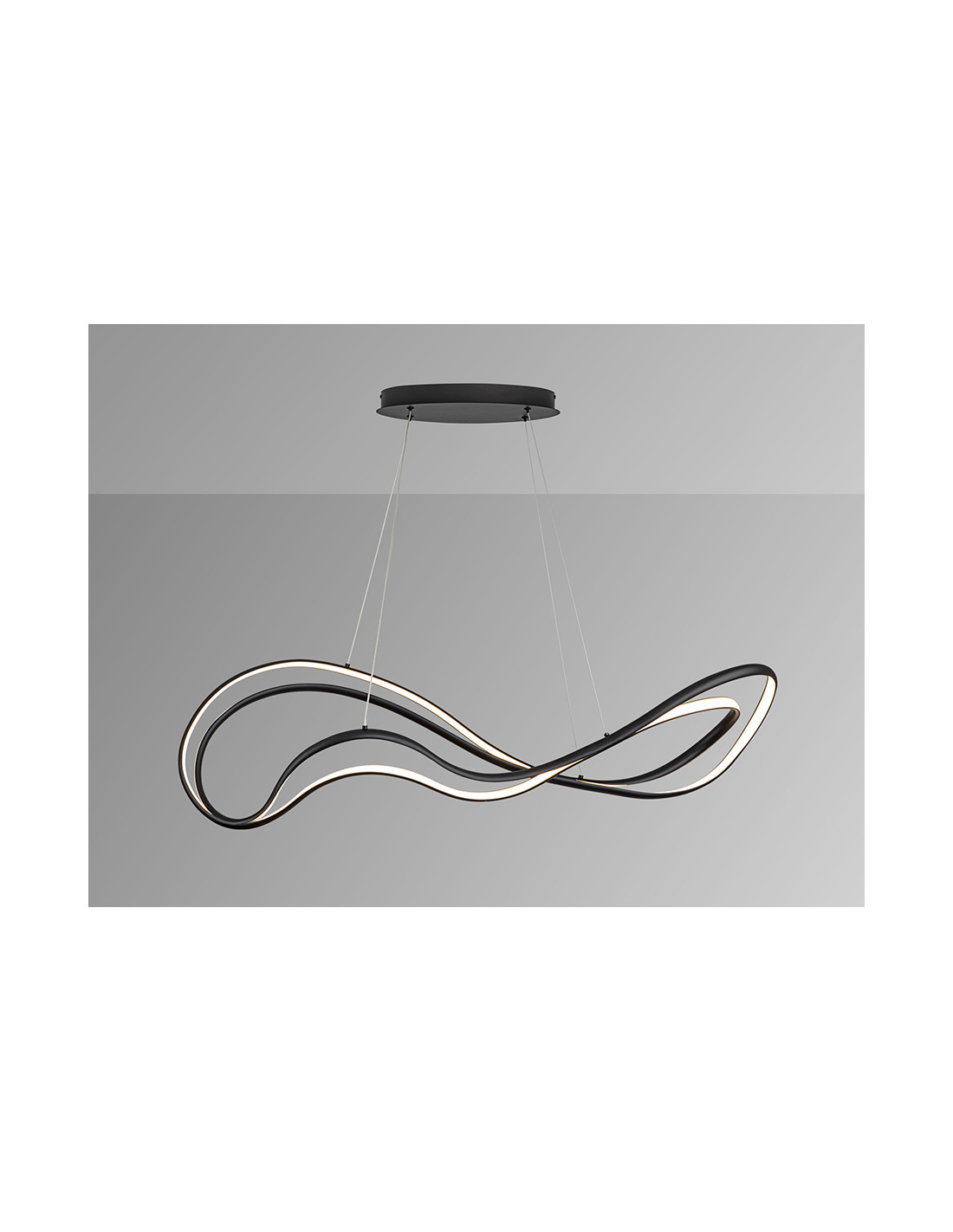 Lámpara de techo realizada en metal y aluminio acabado negro mate arenado. Difusor opal de silicona. Potencia 75W LED. 3.064 lúmenes. Luz cálida (3.000 K). Regulable en intensidad.