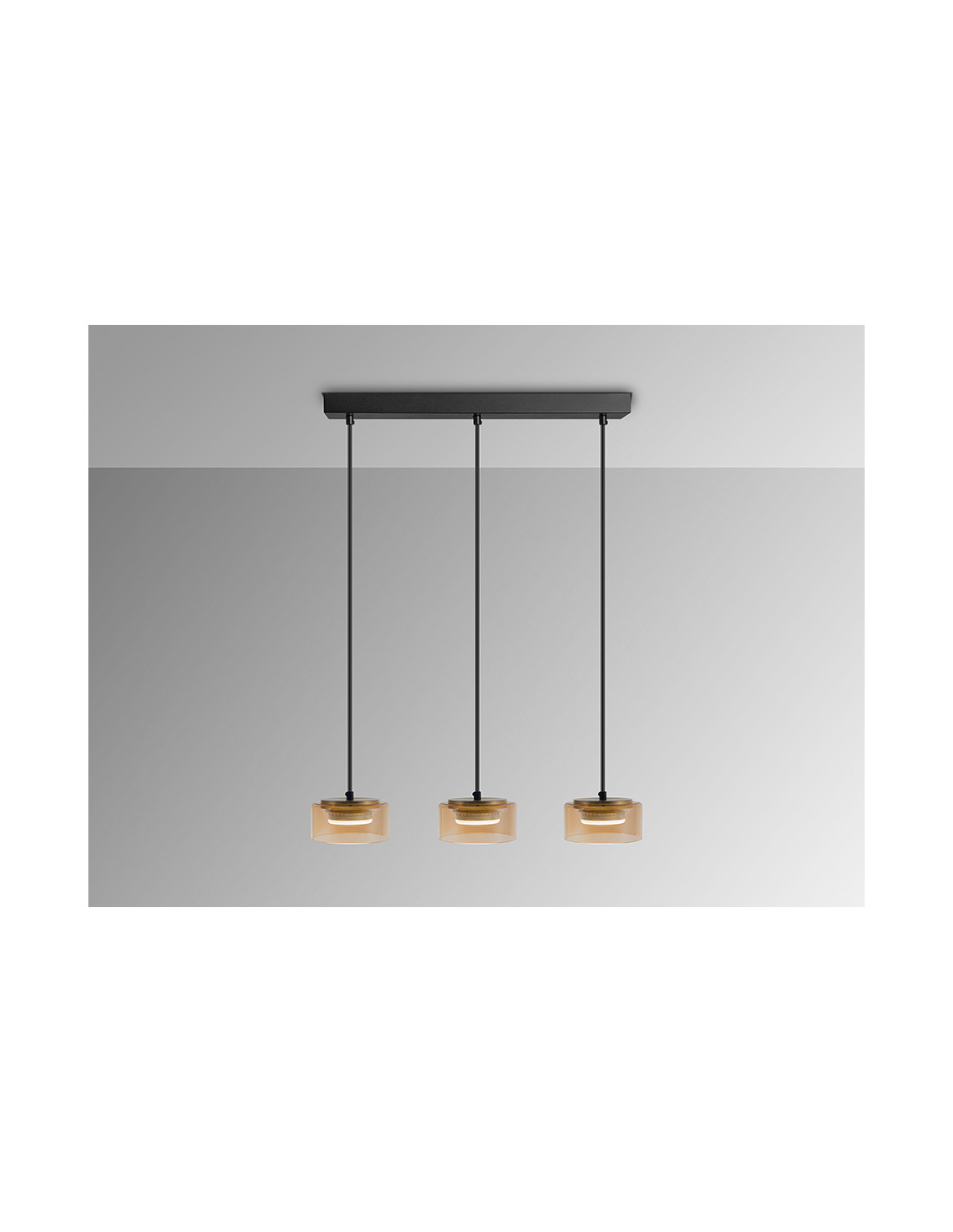 Lámpara realizada en metal acabado negro mate y oro. 3 Tulipas de cristal ámbar. Regulable en altura.