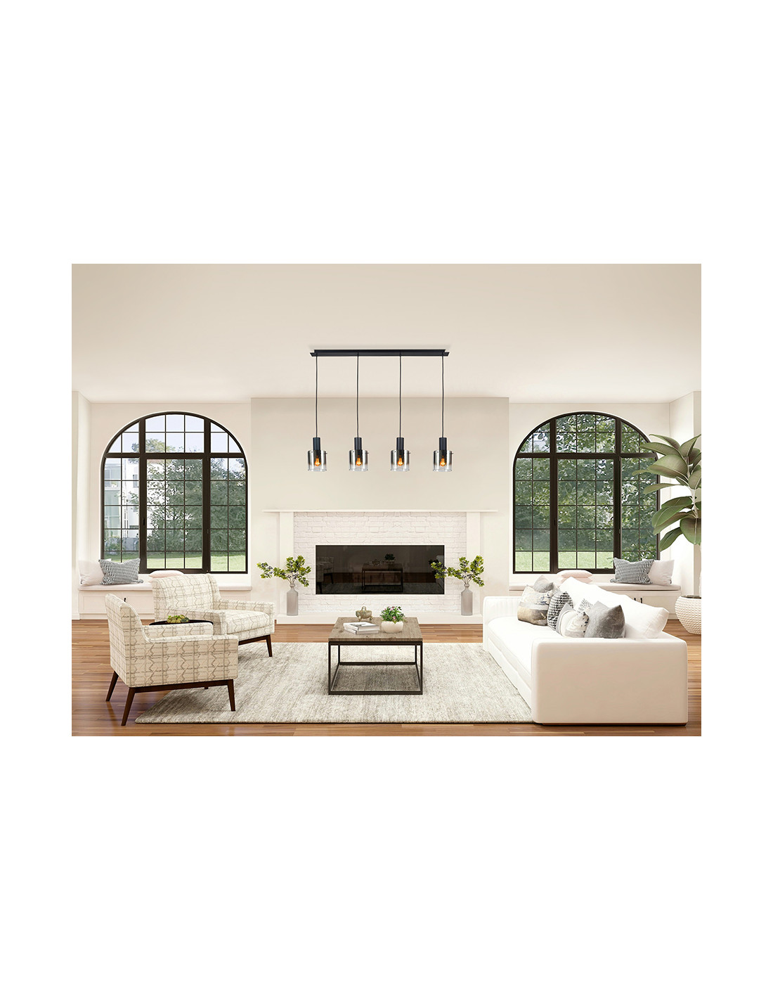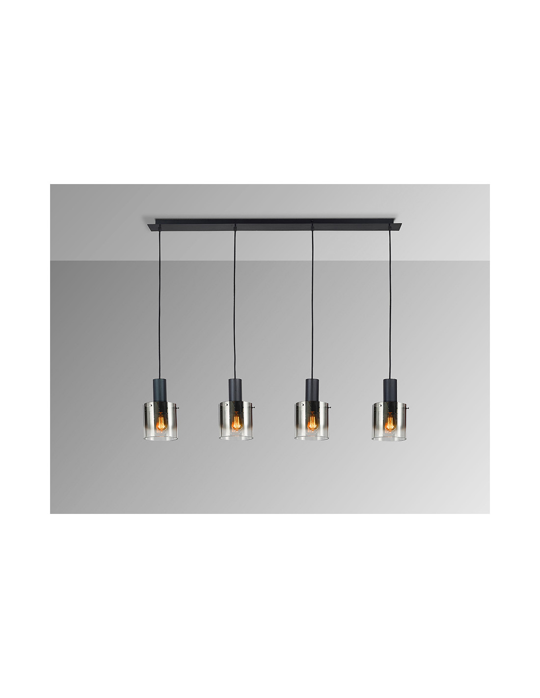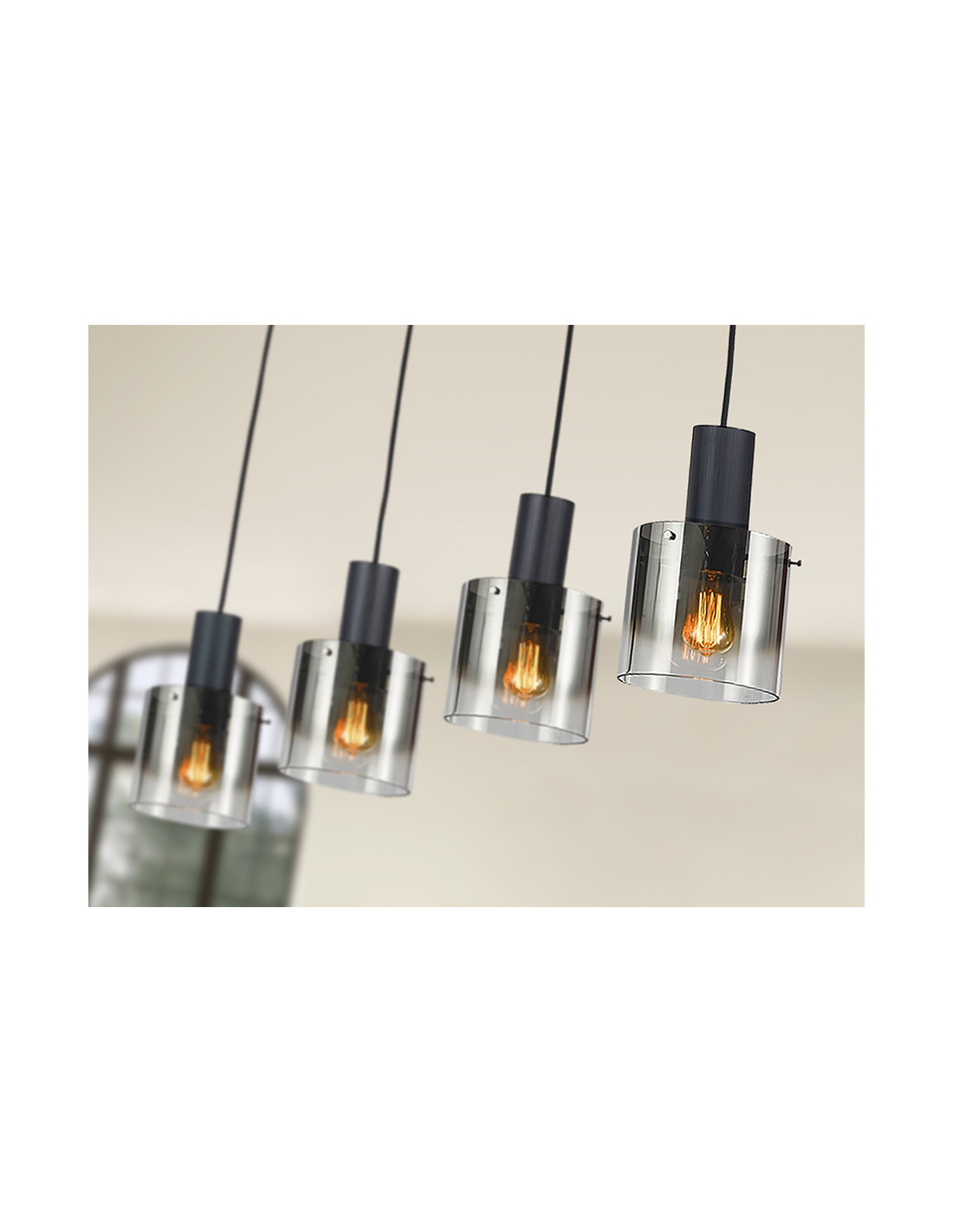 Lámpara realizada en metal acabado negro satinado. 4 Tulipas de cristal smoke difuminado. Cable textil. Regulable en altura. Portalámparas E27