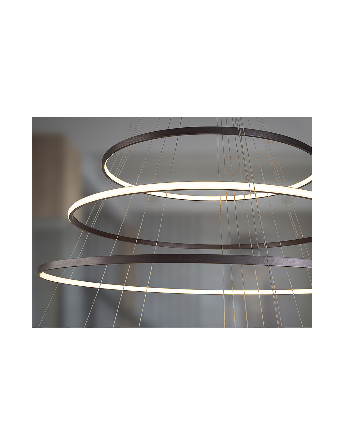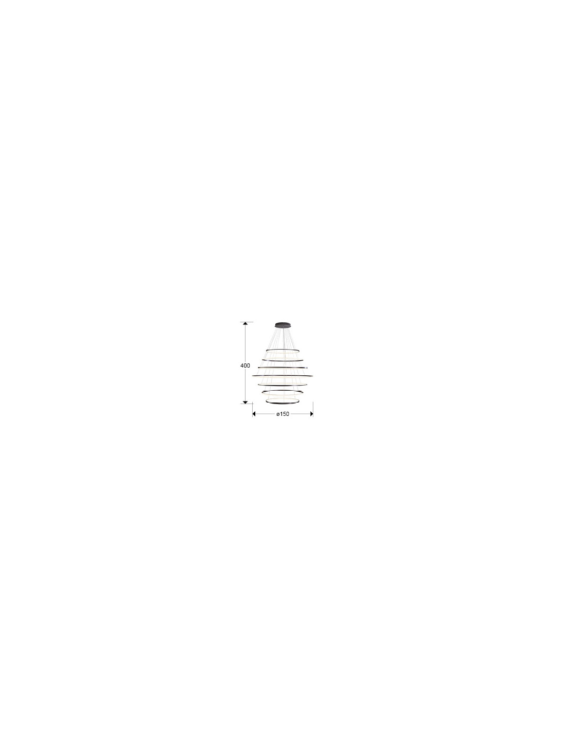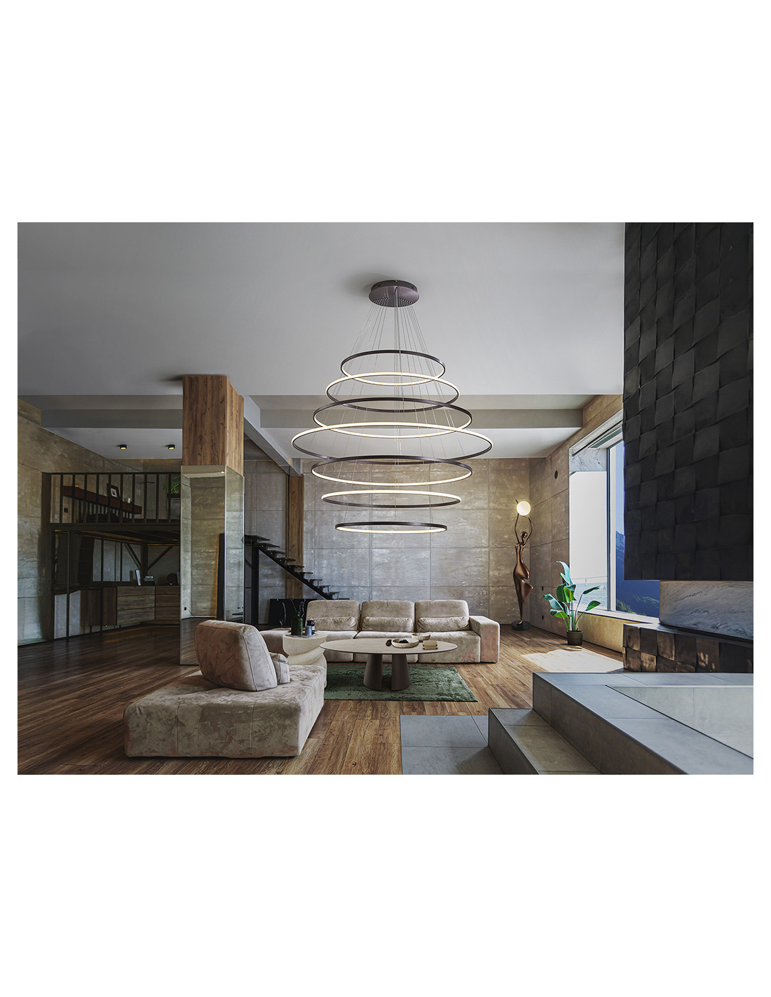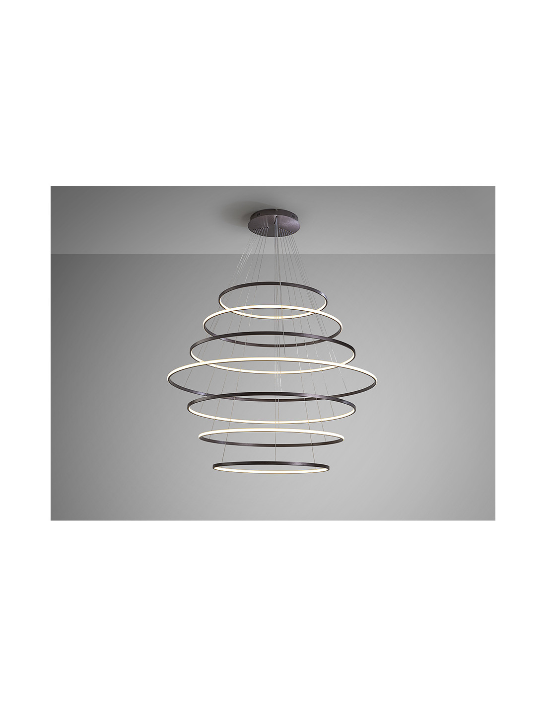 Lámpara de 7 aros realizada en aluminio, acabado bronce oscuro. Difusor de silicona. LED 220W,11.000lm CCT: 2700-5000 K. DIMABLE. Incluye mando a distancia.