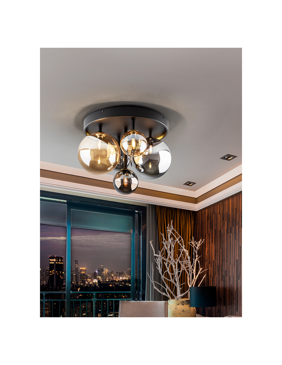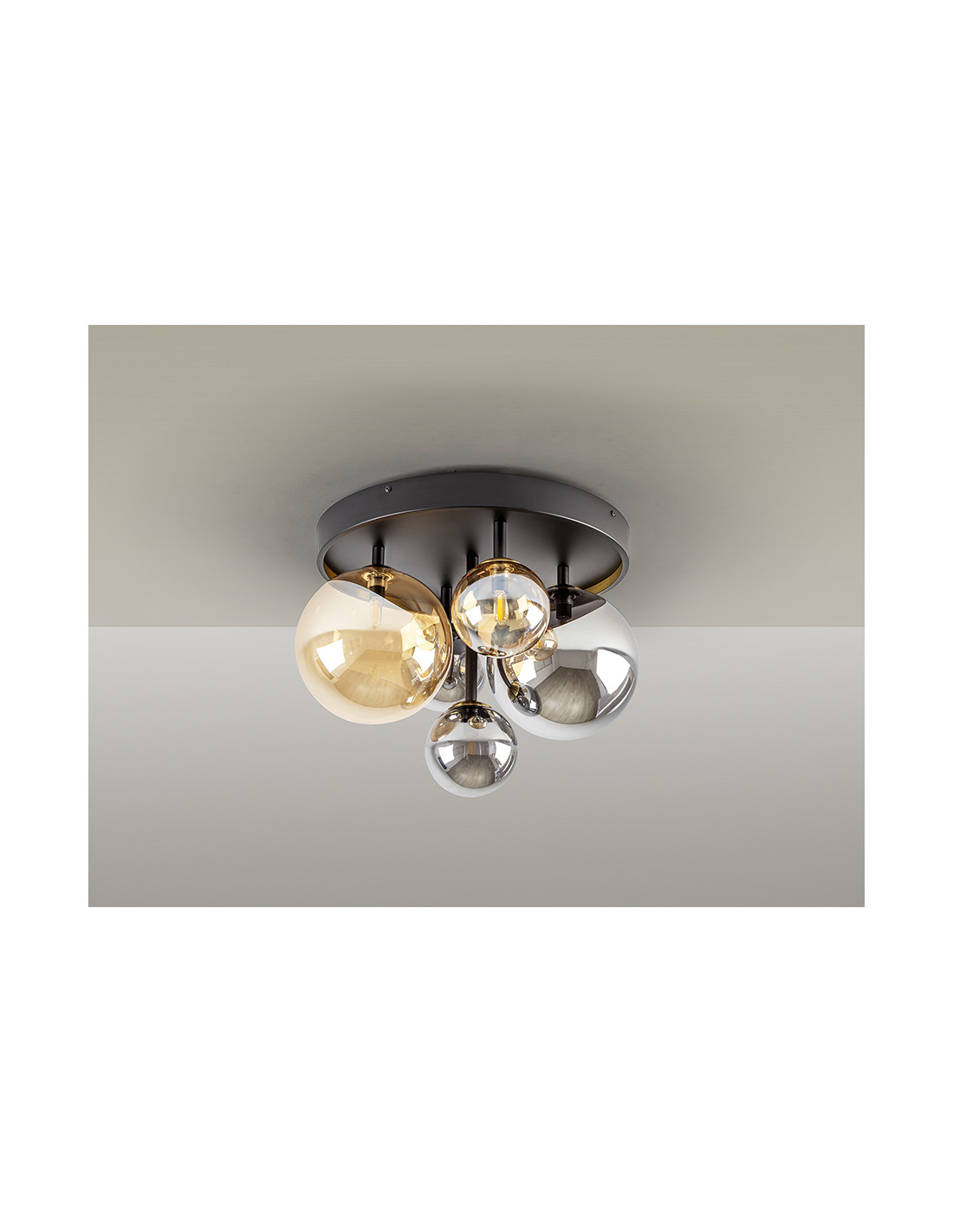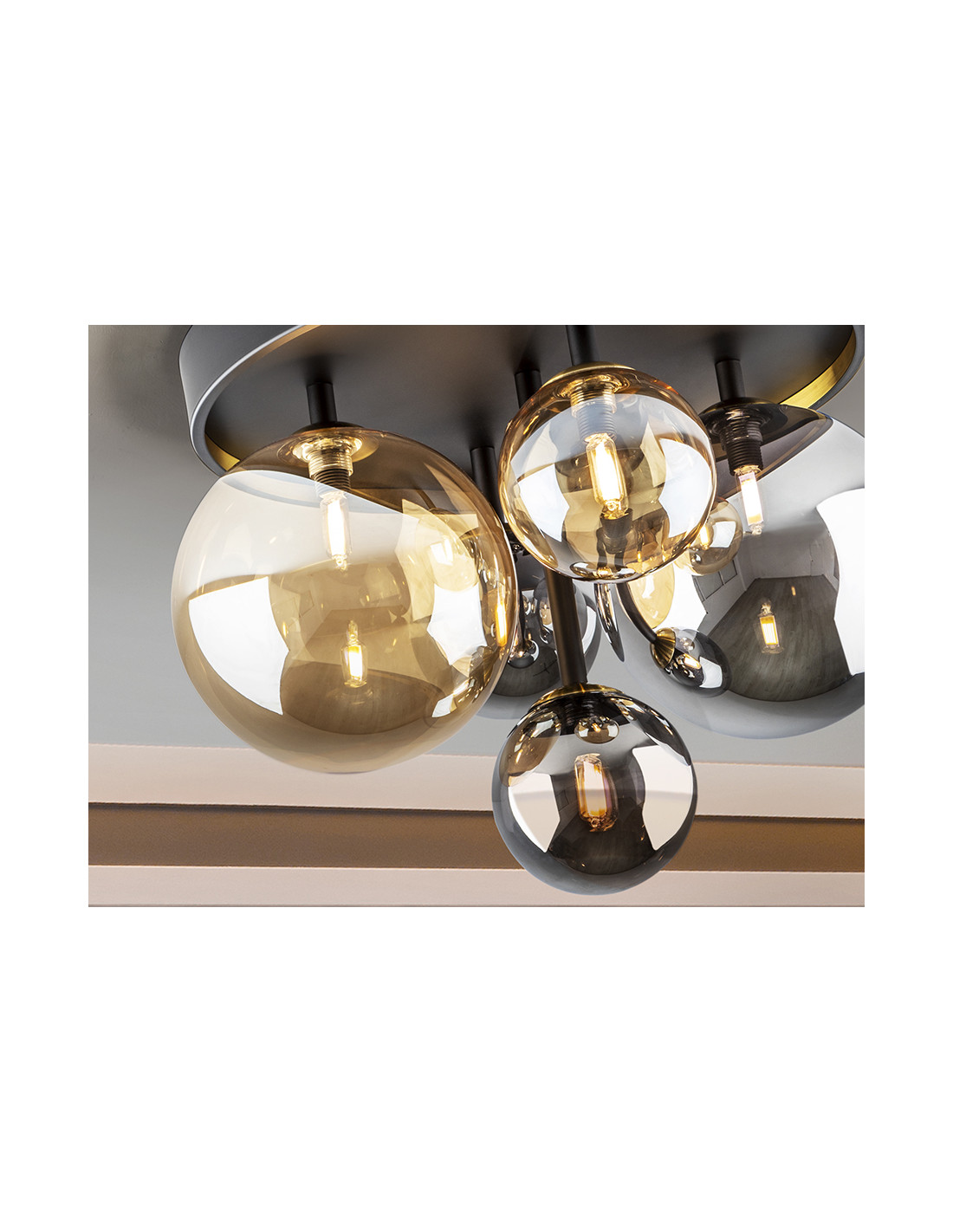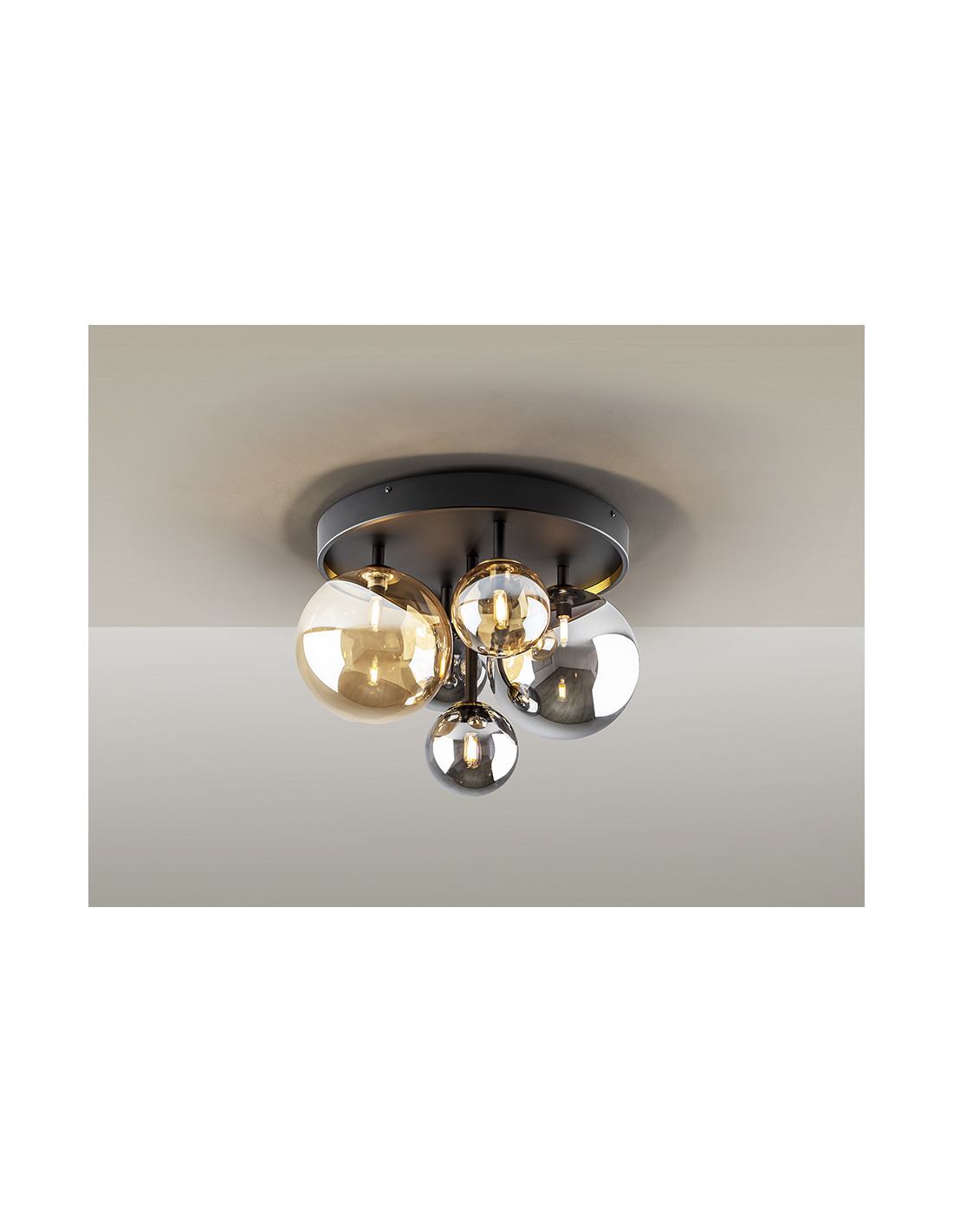 Plafón de techo de 5 luces realizada en metal acabado negro mate, con detalles de latón satinado. Tulipas de cristal esféricas de 12 y 20 cm, en acabados ámbar y gris smoke espejado. Incluye bombillas tipo led.