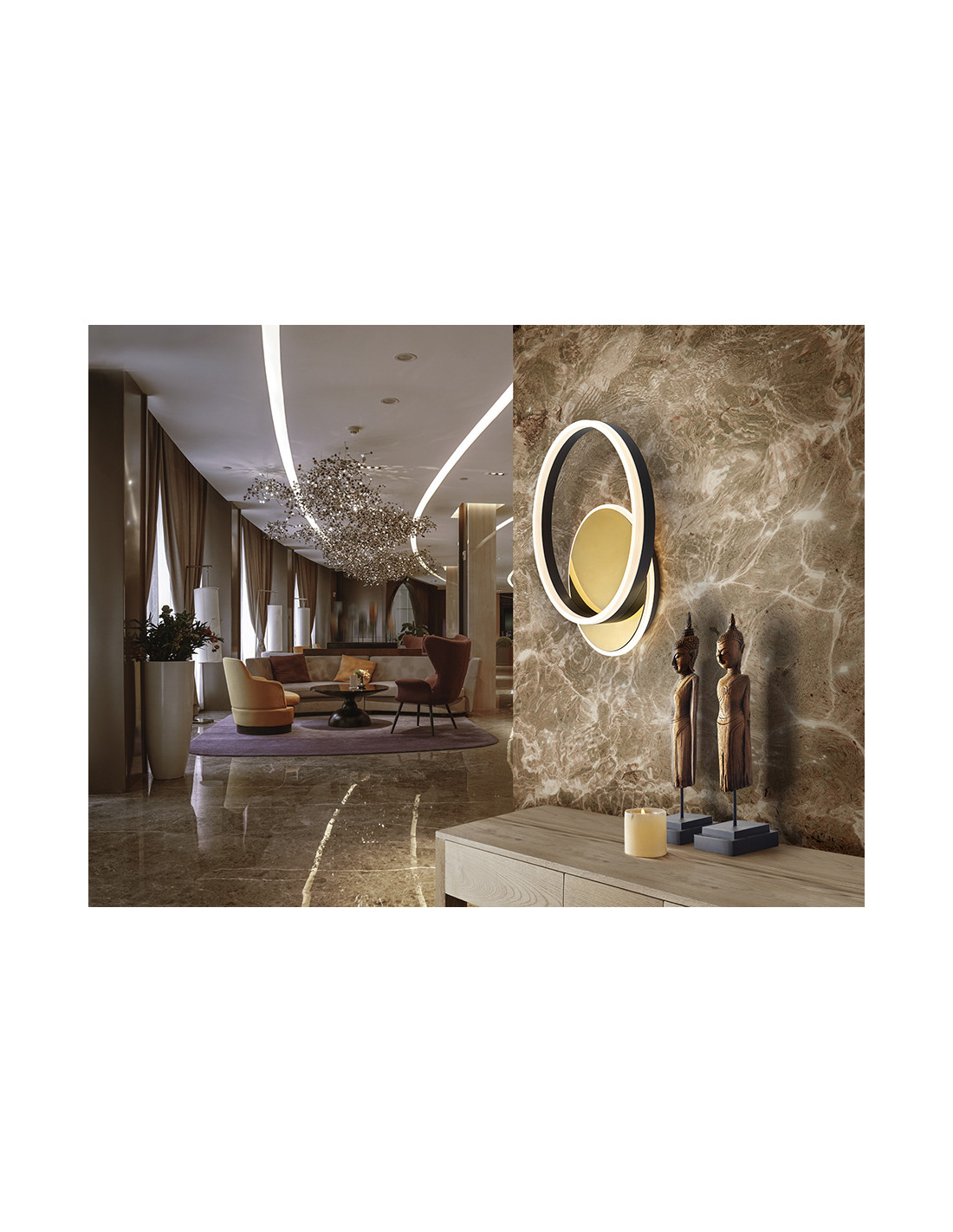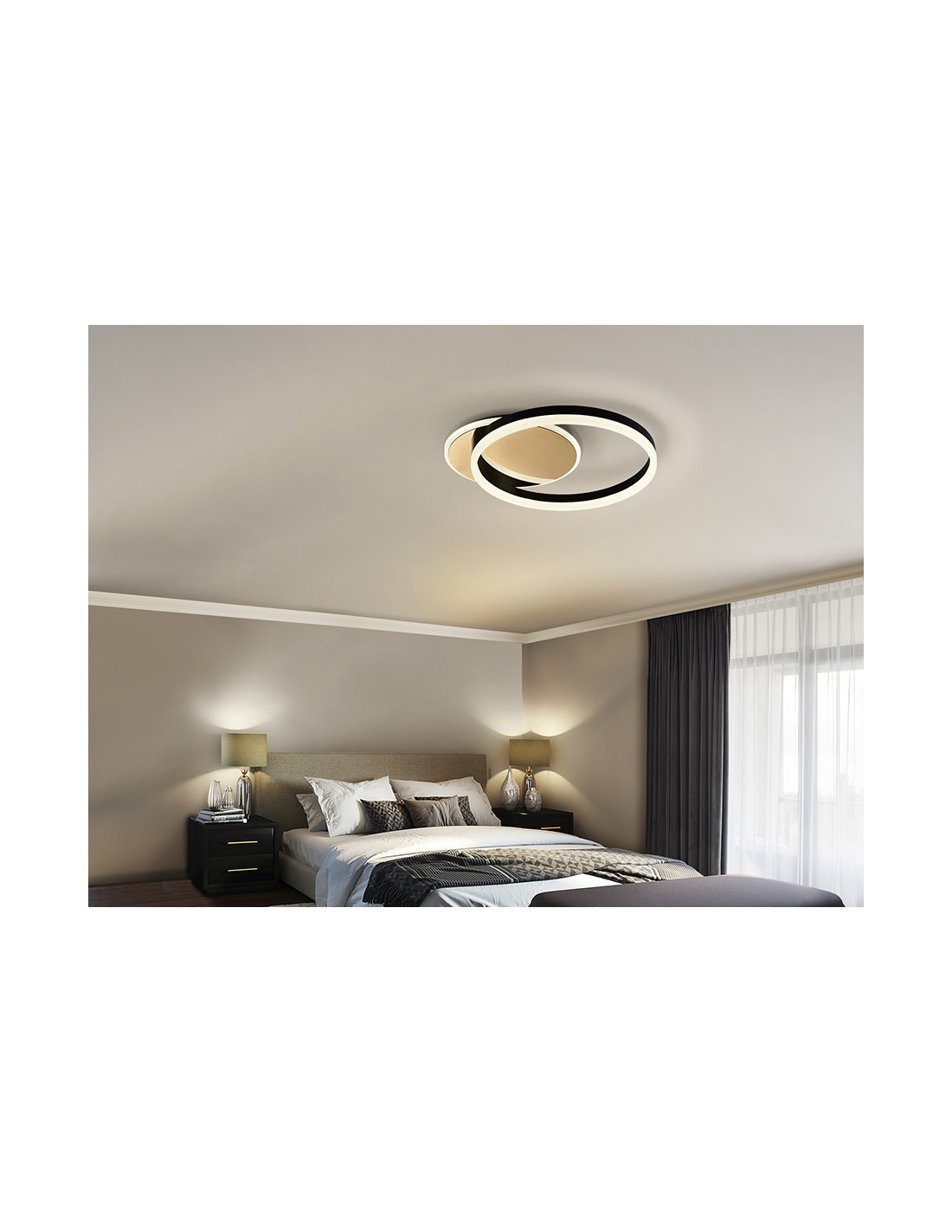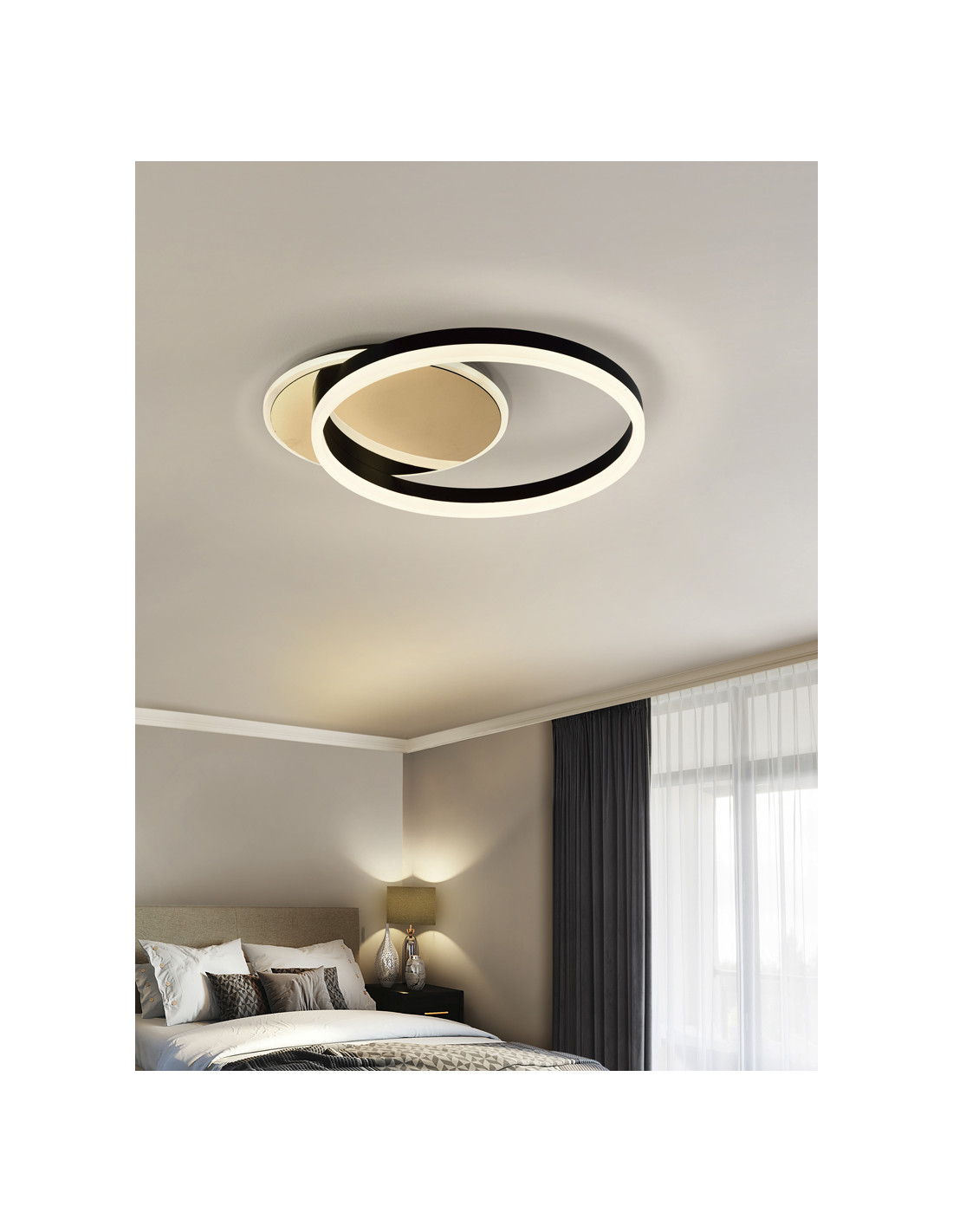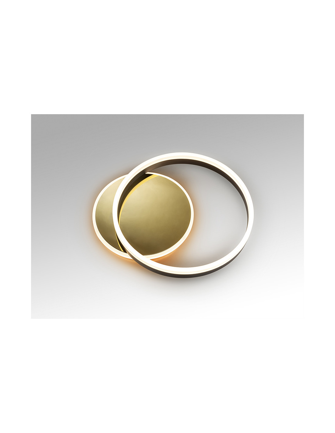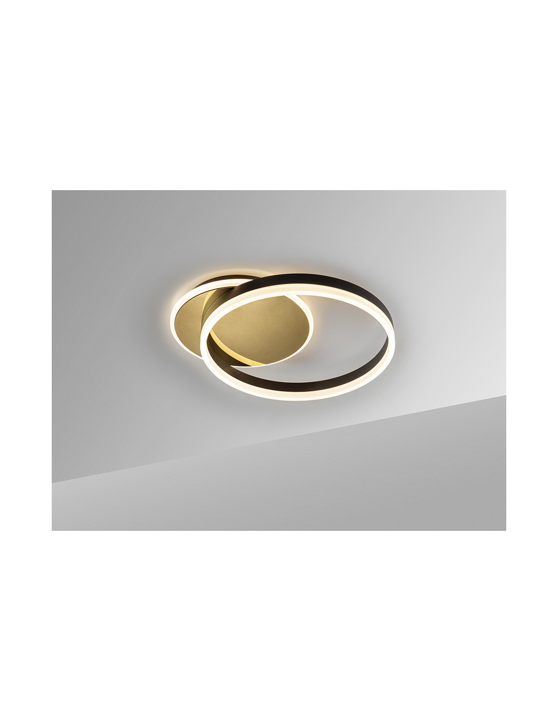 Plafón para colocar tanto en techo como de aplique de pared. Plafón de techo o aplique de pared led, realizado en acero acabado oro y aluminio acabado negro mate. Difusor de acrílico opal para un reparto de la luz más uniforme. Consumo 38 watios y potencia de 1.400 lúmenes de luz cálida (3.000 K).
