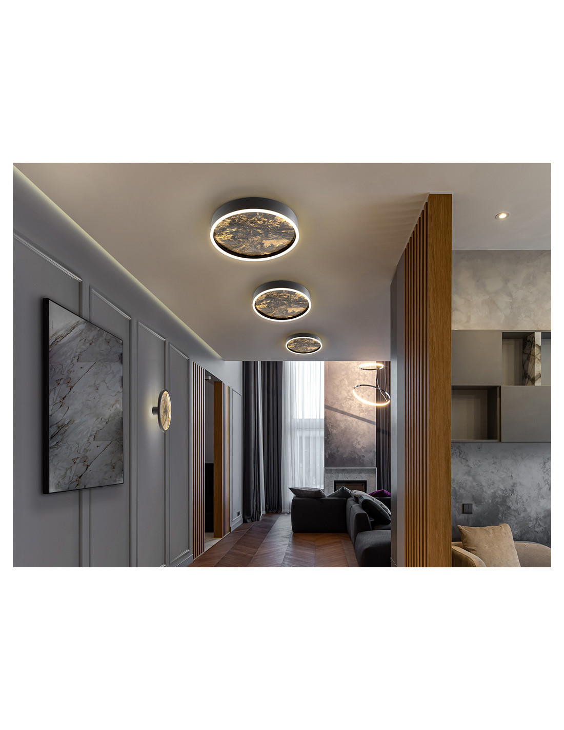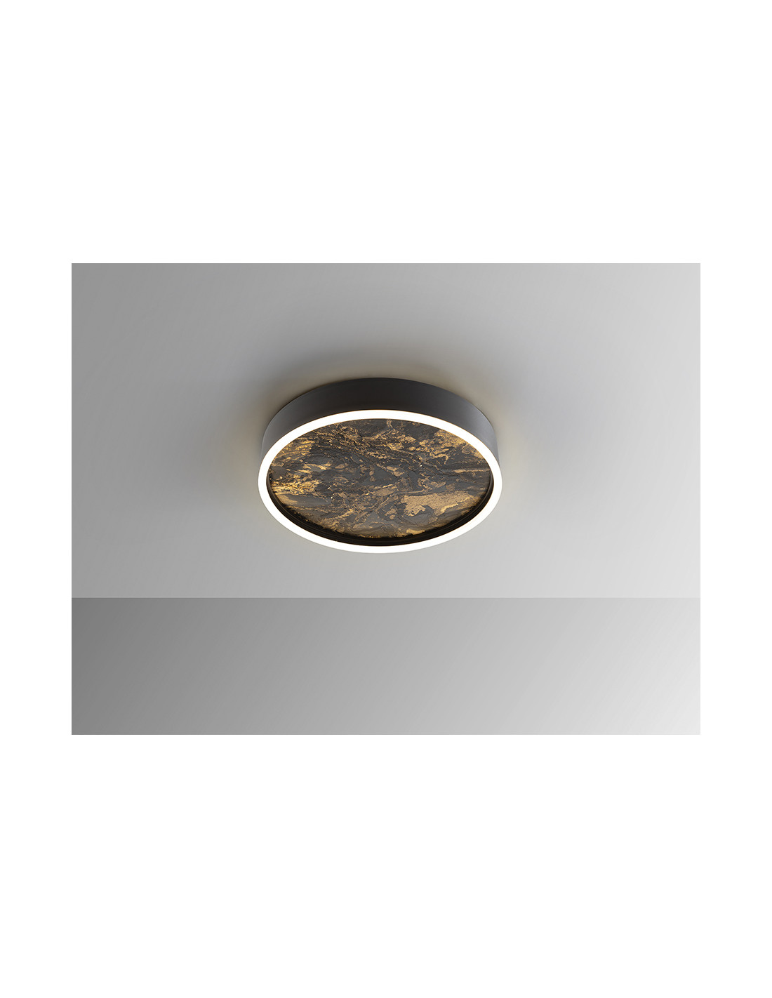 Plafón de techo realizado en metal acabado negro. Difusor traslúcido de pizarra multicolor y aro de acrílico opal. Luz LED 36+20W, 1080 lm, cambio color CCT, 3000/4000/6000K.