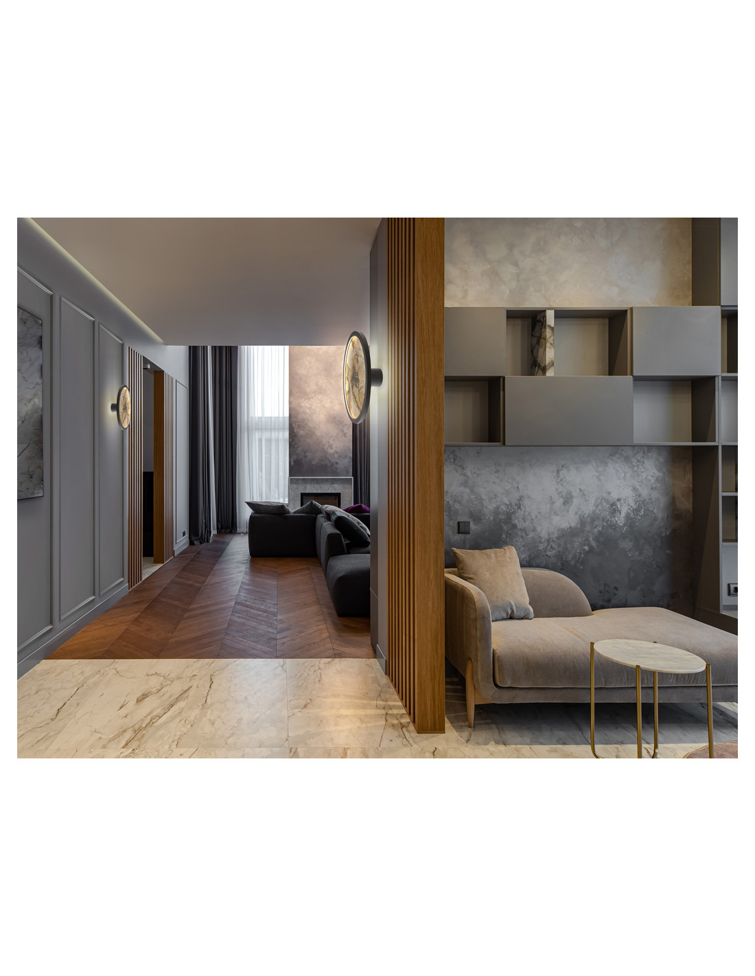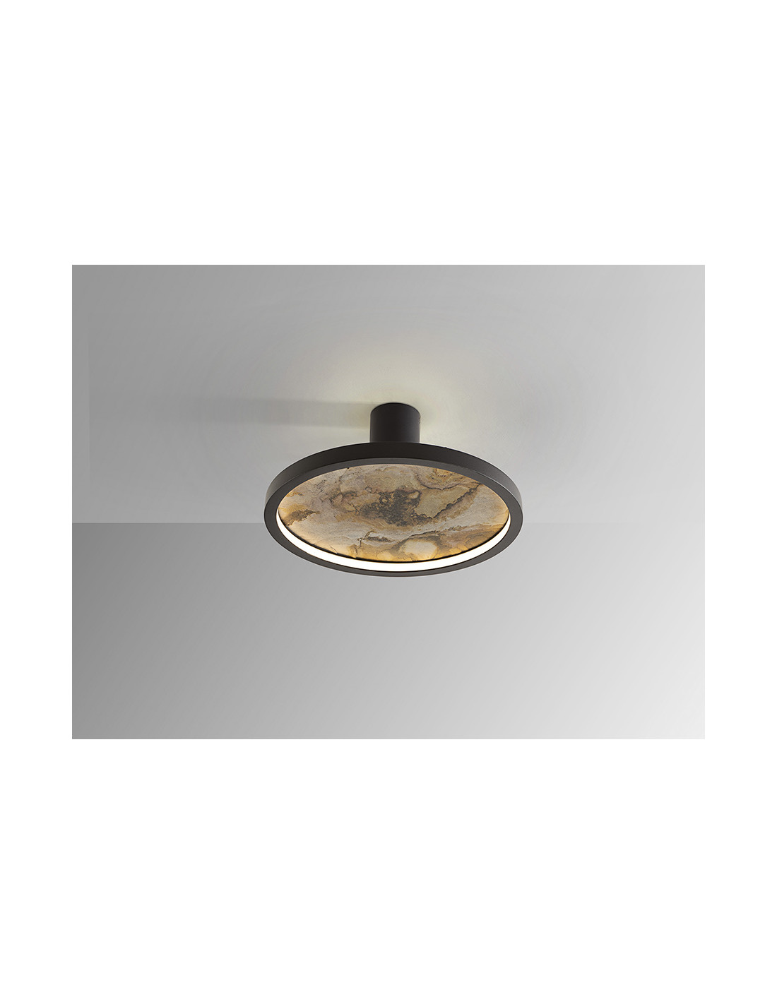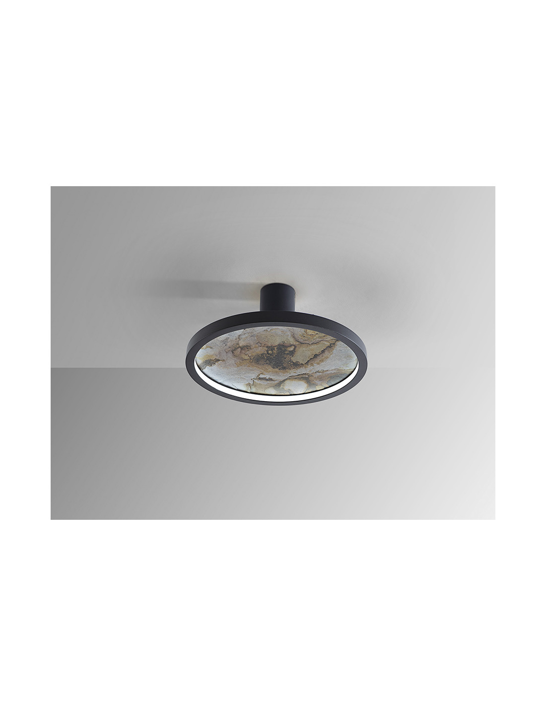 Lámpara de pared o plafón de techo redondo. Realizado en metal acabado negro y pizarra multicolor, con aro de acrílico opal. Luz LED 25W, 334 lm, cambio color CCT, 3000/4000/6000K.