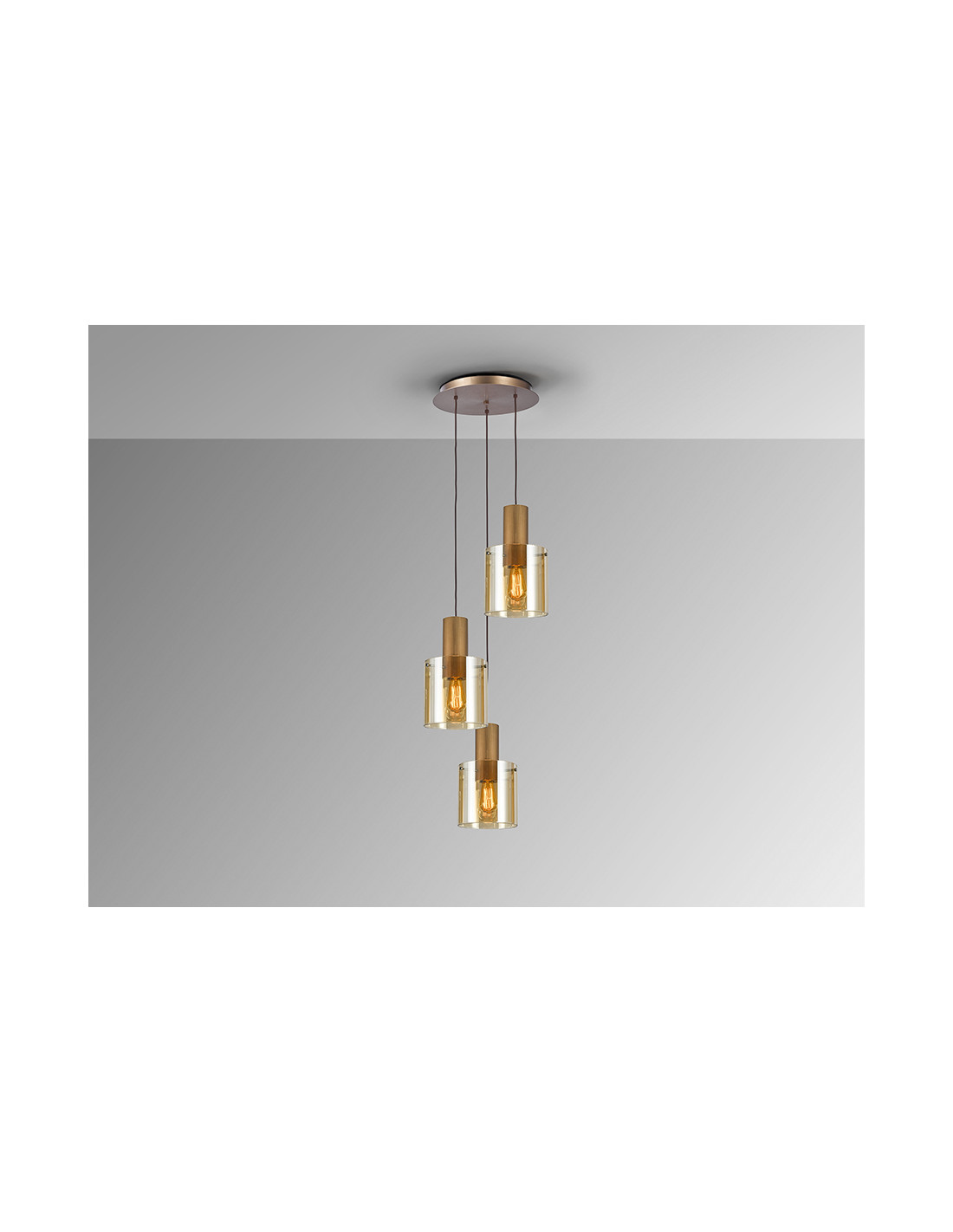 Lámpara realizada en metal acabado cobre satinado. 3 Tulipas de cristal ámbar. Cable textil. Regulable en altura. Portalámparas E27