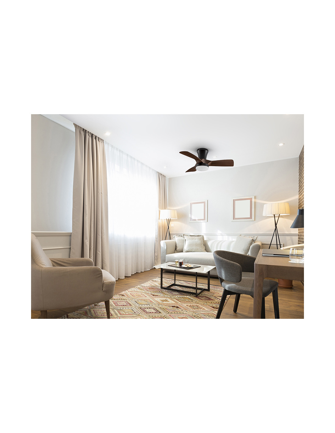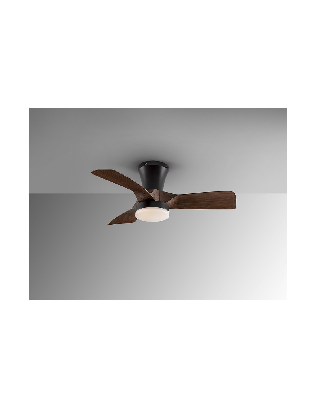 Ventilador de techo con luz LED DIMABLE y CCT (temperatura de luz regulable). Realizado en metal acabado negro mate y aspas en acrílico acabado madera de nogal. Difusor acrílico opal. Motor DC, 6 velocidades e inversión. Temporizador, función brisa