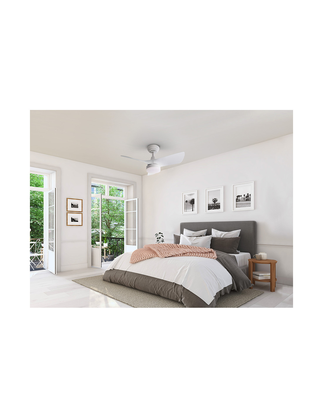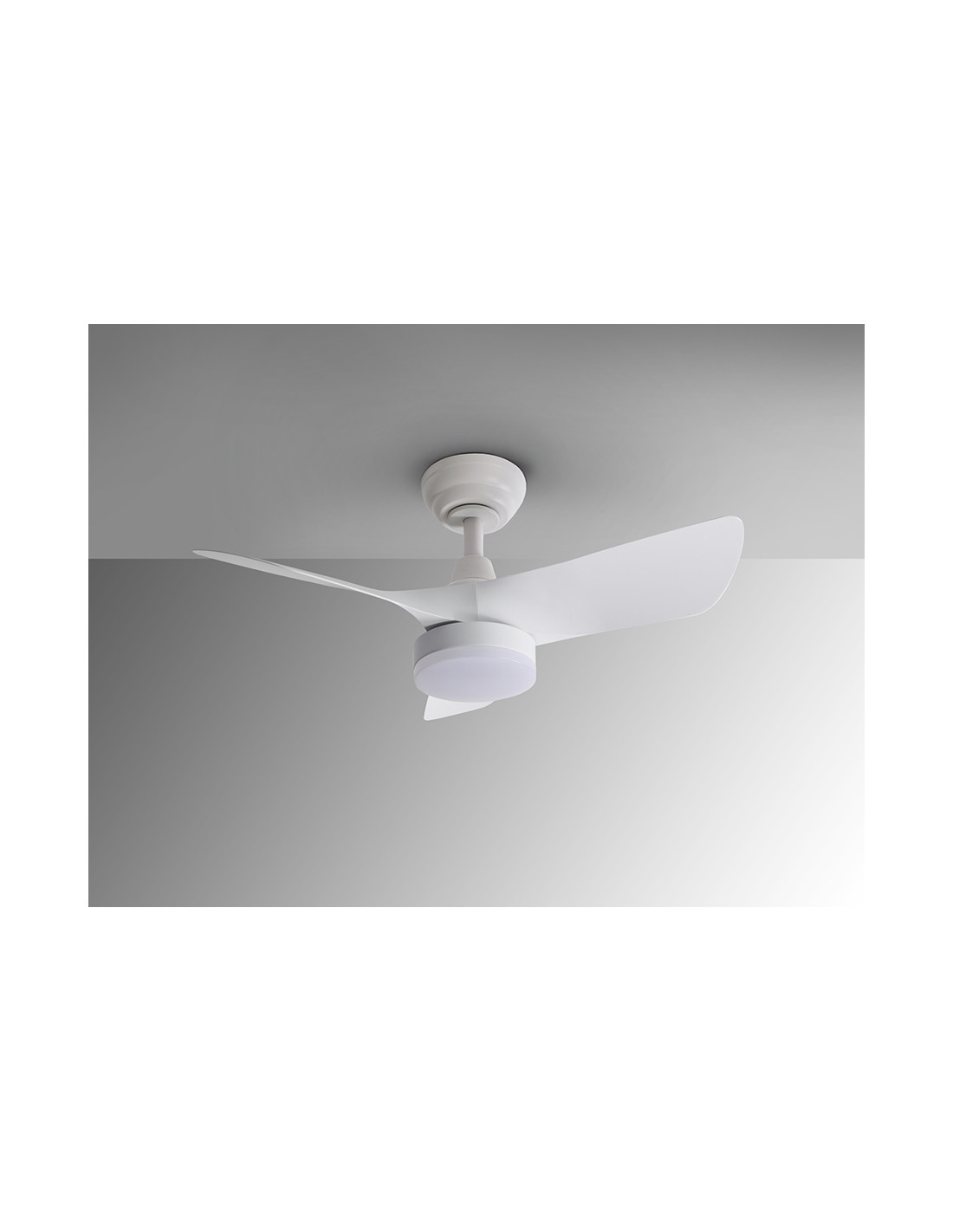 Ventilador de techo con luz LED DIMABLE y CCT (temperatura de luz regulable). Realizado en metal y aspas en acrílico, acabado blanco mate. Difusor acrílico opal. Motor DC, 6 velocidades e inversión. Temporizador, función brisa y memoria.