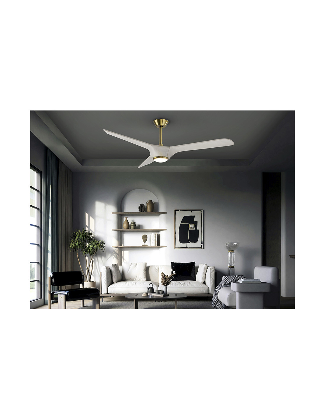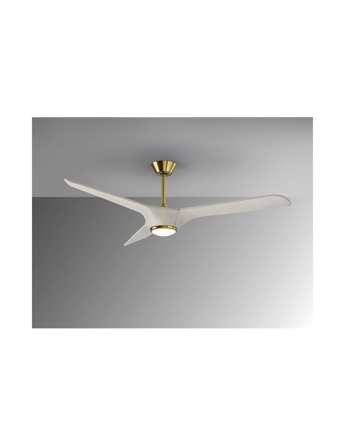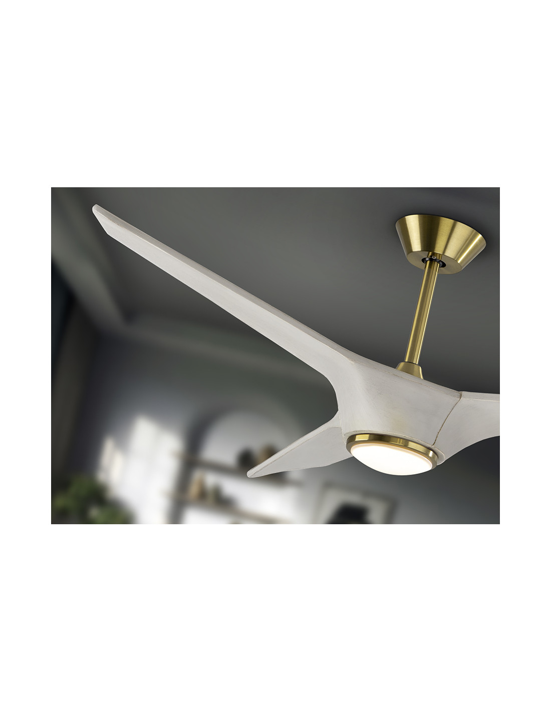 Ventilador de techo con luz LED DIMABLE. Realizado en metal acabado bronce y aspas en madera acabado blanco. Difusor de acrilico opal. Ventilador con Motor DC de 6 velocidades e inversión. LED CCT de 3 tonos de temperatura de color.