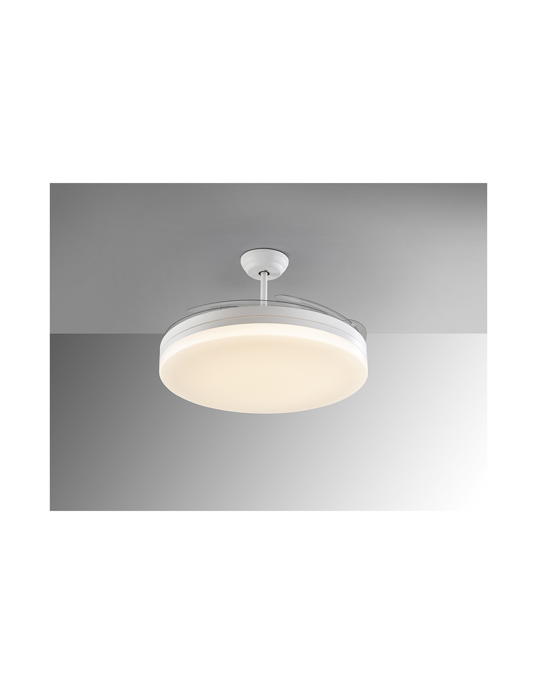 Ventilador de techo con luz LED DIMABLE y temperatura color regulable CCT. Realizado en metal acabado blanco mate y aro en blanco. Difusor opal y aspas escamoteables en acrílico transparente. Motor DC de 6 velocidades e inversión. Temporizador.